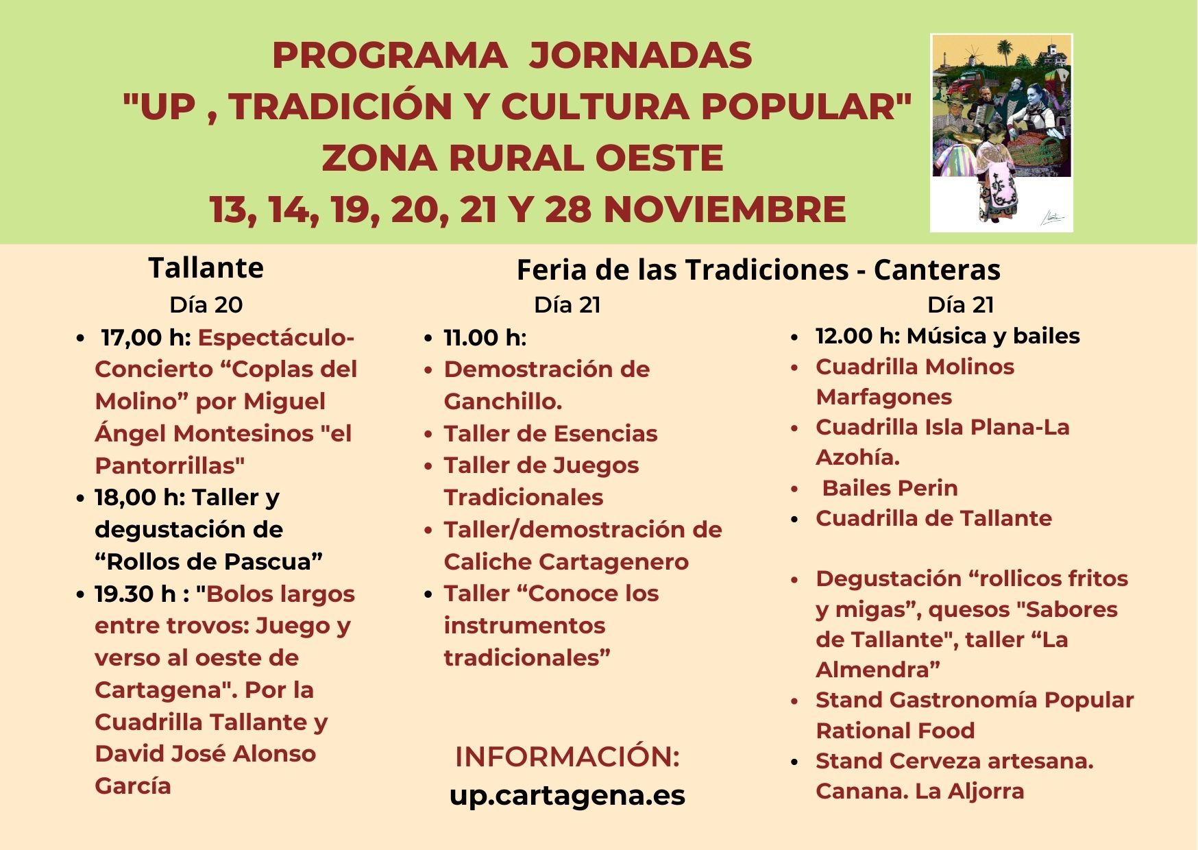 Por último podrán disfrutar de dos espectáculos únicos en nuestro municipio, “Concierto Las Coplas del Molino” por Miguel Ángel Montesinos “El Pantorrillas”, y “Trovos y Bolos”, con la Cuadrilla de Tallante y la presentación del libro “Bolos Largos del Campo de Cartagena” de David José Alonso García.