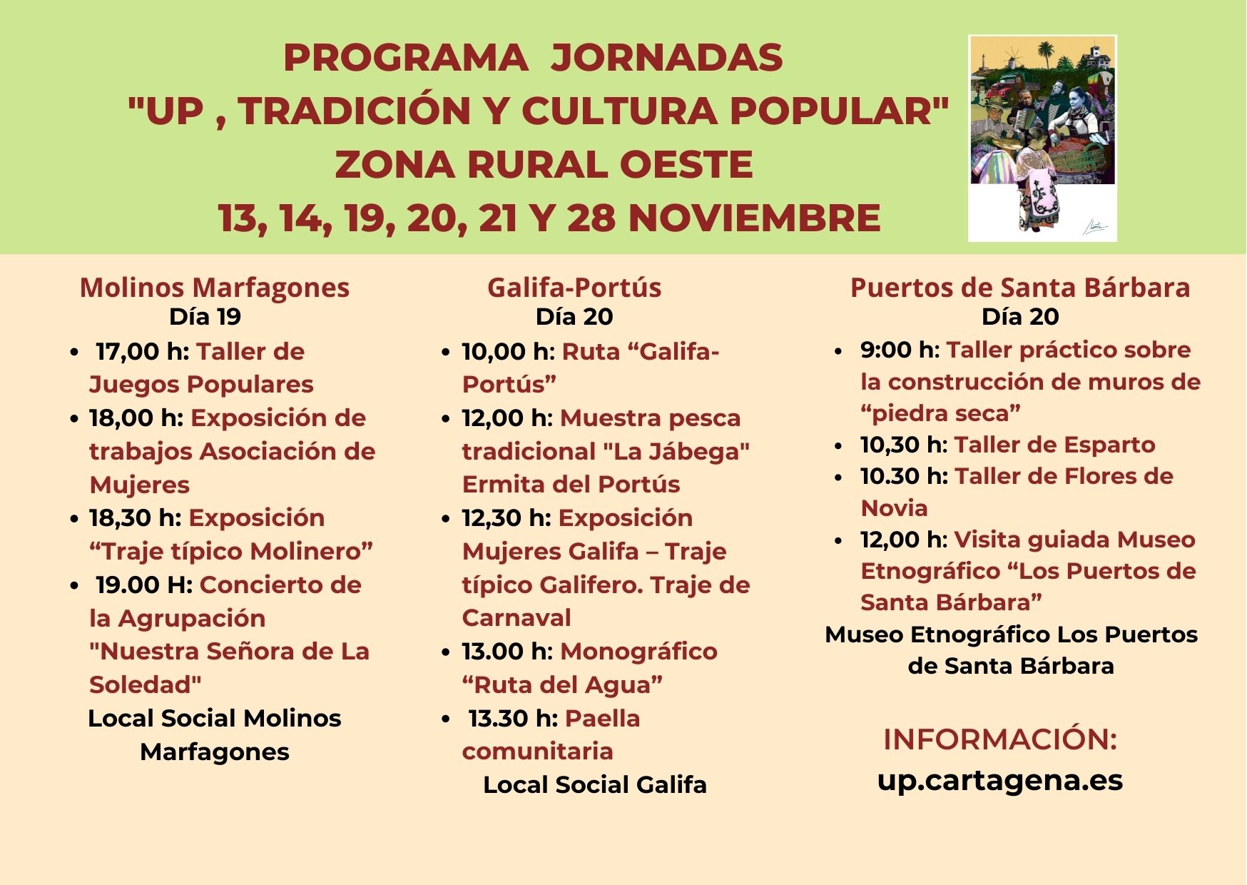 Cordiales, bolos cartageneros, trovos, rollos de pascua... son algunas de las tradiciones de las que se puede disfrutar este fin de semana en la zona oeste. La Universidad Popular ha organizado unas jornadas de tradición y cultura popular para conmemorar su 40 aniversario. Las jornadas han empezado este viernes en Molinos Marfagones. El sábado se sucederán en Galifa, El Portús, Los Puertos de Santa Bárbara por la mañana, y Tallante por la tarde. Por su parte, el domingo se celebrará la Feria de Las Tradiciones en la Plaza Pico Roldán de Canteras.