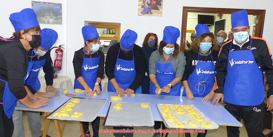 Al ser un día de lluvia amenazante, los actos se ubicaron todos en el interior del local social, que a continuación se transformó en un taller gastronómico para que Juan Diego (qué gran destreza y experiencia la suya, por cierto) explicase a quince aprendices cómo se elaboran los rollos de pascua, en diferentes diseños. Fue un éxito por el desarrollo como por la exquisitez de probar estos rollos y rollicos recién hechos.