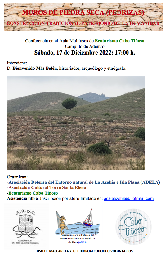 La construcción de muros de piedra seca fue declarada Patrimonio Cultural Inmaterial de la Humanidad por la UNESCO en noviembre del 2018 en distintos territorios de varios países mediterráneos. El máximo experto en este tipo de construcciones artesanas, Bienvenido Más Belén, detallará las características y procedimientos. En la imagen adjunta se observa al historiador, arqueólogo y etnógrafo en la zona oeste con este tipo de construcciones detrás.