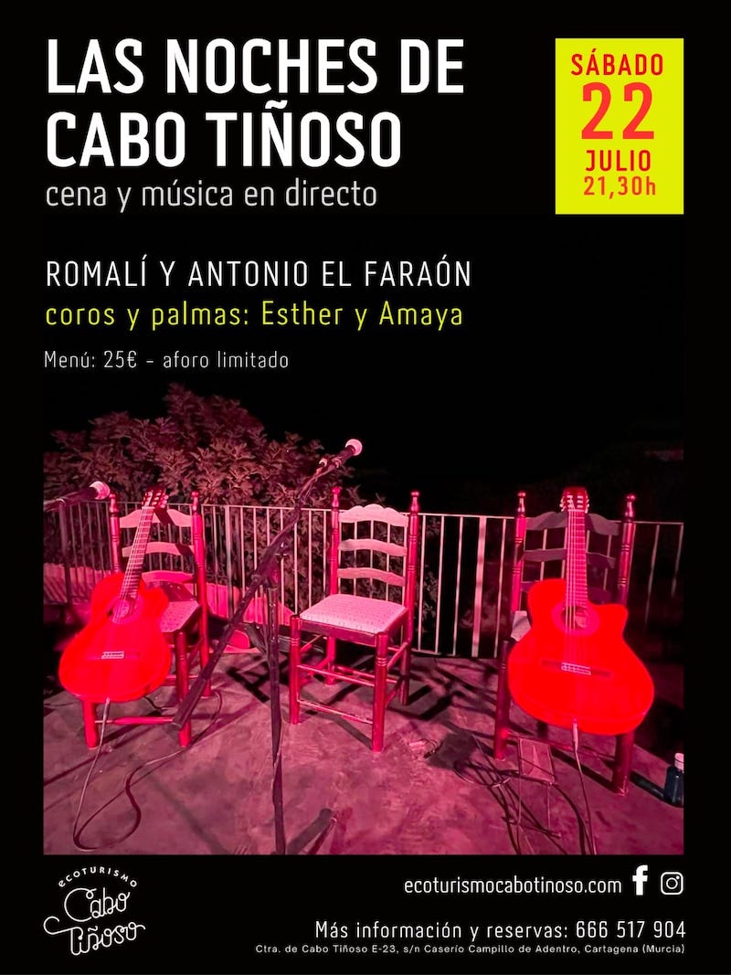 Leer más...Cena y música en directo con las propuestas de ecoturismo, que este sábado traen, desde las 21.30 horas, a Romalí y Antonio 'El Faraón' con Esther y Amaya en los coros y palmas. El precio es de 25 euros.