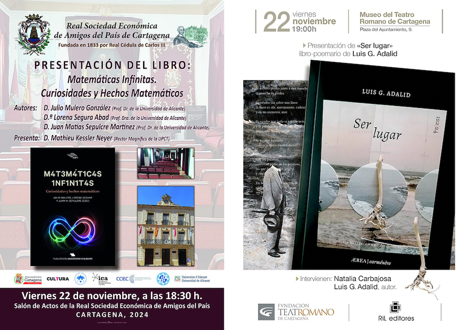 La Real Sociedad Económica de Amigos del País acoge en su salón de acteos esta tarde la presentación de la obra 'Matemáticas infinitas. Curiosidades y hechos matemáticos', cuyos autores son Julio Mulero, Lorena Segura y Juan Matías Sepulcre, siendo el rector de la UPCT, Mathieu Kessler, quien presentará el acto. Por su parte, el museo del Teatro Romano es el marco en el que se drá a conocer el poemario 'Ser lugar', de Luis González Adalid.