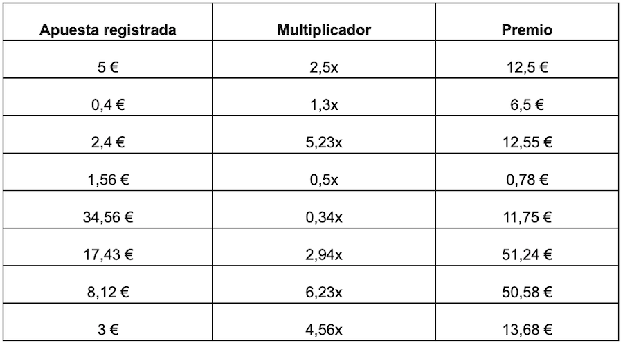 Este recuadro sirve para apreciar cómo influye tanto el valor de la apuesta como el de los multiplicadores. Por supuesto, una apuesta alta se traduce, generalmente, en ganancias proporcionales, siempre y cuando el multiplicador sea lo suficientemente alto.