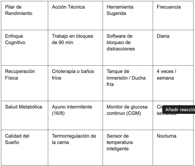 Este esquema permite una visión clara de los ajustes necesarios para mantener un motor biológico afinado. Al separar las responsabilidades de nutrición, ejercicio y descanso en protocolos verificables, el individuo deja de depender de la intuición para basar su bienestar en métricas objetivas y resultados tangibles.
