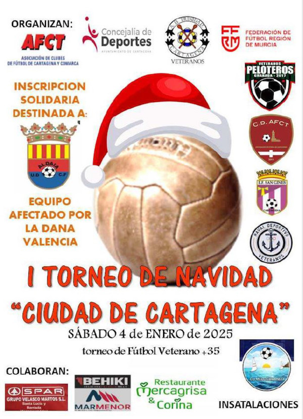 Este sábado 4 de enero se celebra la primera edición del torneo de Navidad de fútbol 'Ciudad de Cartagena', que combina deporte, solidaridad y espíritu navideño reuniendo a equipos con jugadores con más de 35 años de edad de todo el territorio nacional siendo el objetivo apoyar a la UD Aldaia CF, club de la Comunidad Valenciana afectado por los daños causados por la reciente DANA, a quien irá destinada la recaudación.