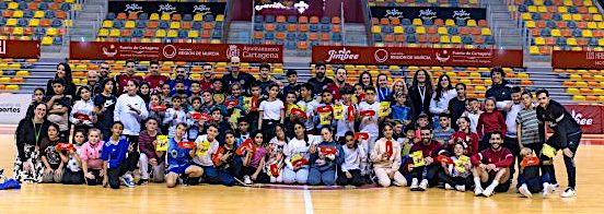Una representación de alumnos y alumnas del CEIP Aníbal, CEIP Asdrúbal y CEIP Nuestra Señora del Mar se convertían en protagonistas del entrenamiento del Jimbee FS Cartagena Costa Cálida en la jornada de hoy lunes. La semana para los de Duda comenzaba con trabajo físico en gimnasio para continuar, acto seguido, en pista. Como colofón a la sesión de hoy, el equipo melonero se marcaba unos divertidos y dinámicos juegos sobre el parqué con quienes han estado animando durante toda la sesión. Los escolares han invadido las gradas con pancartas de lo más trabajadas y han participado de la actividad con mucha motivación y mostrando un comportamiento ejemplar.