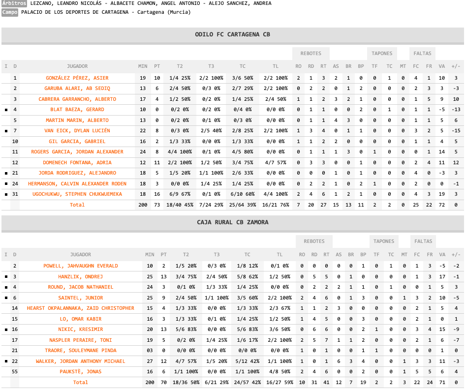 Un triple de Jorda reactivó el marcador a los 3'20". Era la primera canasta local en este cuarto. Después, Ugochukwu puso el 61-54 y el entrenador visitante tuvo que parar el partido con un 'tiempo muerto', al igual que hizo su colega cartagenerista cuando el marcador se puso más tarde en 64-61. Dos tiros libros fallados por los zamoranos y un triple de Dylan parecían dar carpetazo al partido (70-63), pero a los castellanos les vino entonces la inspiración en el tiro que apenas habían tenido en el partido (71-68), pero les faltó tiempo y los locales supieron rentabilizar su renta (73-70).