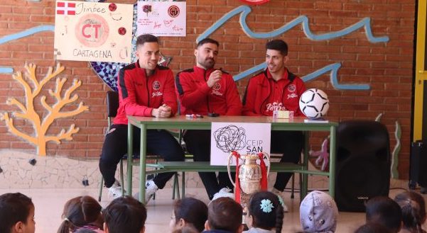 Los jugadores Chemi (portero), Darío y Jesús Izquierdo (capitán del equipo) del Jimbee Fútbol Sala Cartagena Costa Cálida han visitado el CEIP San Félix, donde tuvieron una gran acogida.