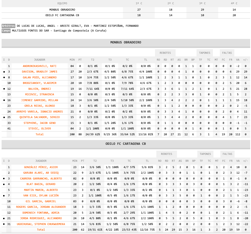 Odilo FC Cartagena CB fue dominado de principio a fin en la pista de Obradoiro, llegando a ir perdiendo por 32 puntos de diferencia durante el tercer cuarto. El base tinerfeño Alberto Cabrera sufrió una lesión que apuntar a que será muy grave y que motivó que su entrenador, Jordi Juste, afectado, no quisiera hablar del encuentro en la rueda de prensa postpartido.