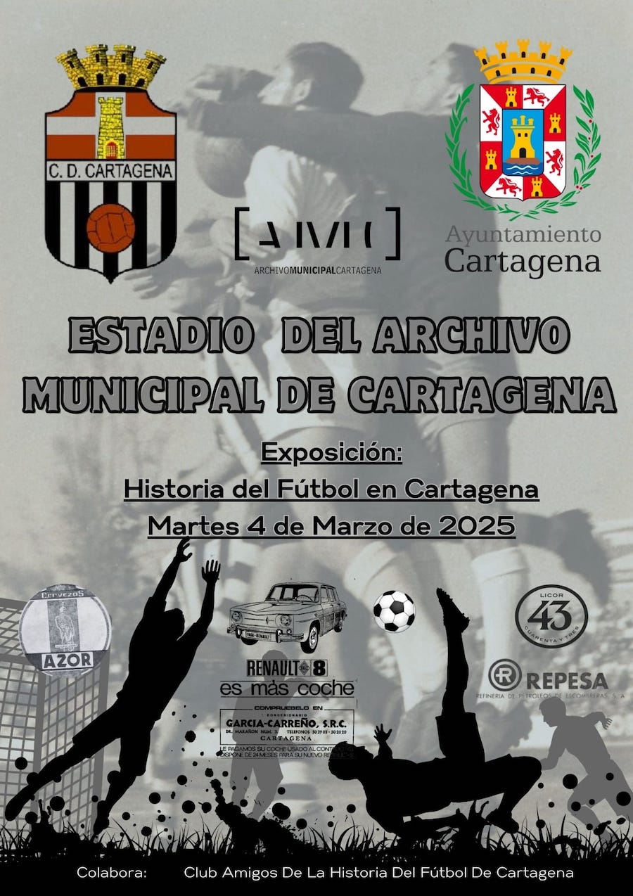 La muestra, que cuenta con objetos y material gráfico de diferentes épocas, se inaugura este martes 4 de marzo, a las 18 horas. Al acto de apertura asistirá el edil de Deportes, José Martínez. Los interesados podrán visitarla hasta el próximo mes de junio, con entrada libre, hasta completar aforo.La iniciativa titulada Historia del Fútbol en Cartagena, impulsada por el Archivo con la colaboración del Club de Amigos de la Historia del Fútbol de Cartagena, hará un recorrido por la evolución de este deporte en el municipio. Para ello, a través de imágenes se recordarán algunos momentos históricos, como los diferentes ascensos de categoría que han realizado los equipos de la ciudad, los estadios más emblemáticos, así como figuras importantes del fútbol de nuestra ciudad. Por ejemplo, la muestra cuenta con un espacio dedicado a los tres cartageneros que han jugado en la selección española: Castillo, Juanmi y Robert Sánchez.