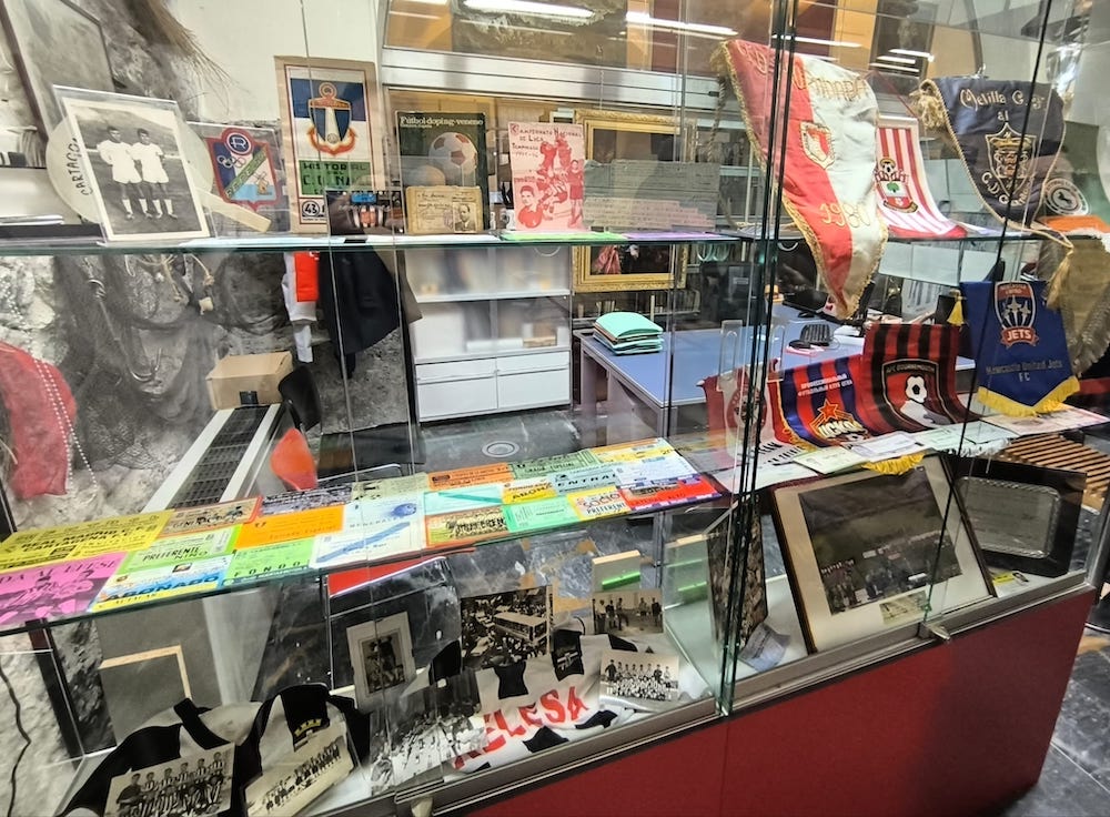 La muestra contiene camisetas, banderines, banderas, insignias, metopas, copas, balones, entradas de partidos, recortes de periódico de las primeras épocas, revistas, numeroso material gráfico, paneles explicativos y hasta una pantalla donde se pueden ver imágenes históricas del fútbol local.