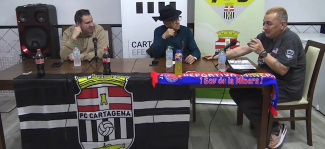 Jerónimo Linares, Lorenzo Vergara y José Pascual López conversan en la tertulia semana que organiza el diario digital Cartagena Actualidad sobre la marcha del FC Cartagena, sobre la novena derrota consecutiva del equipo, del pobre homenaje a Genaro Zapata, de las soluciones de futuro...