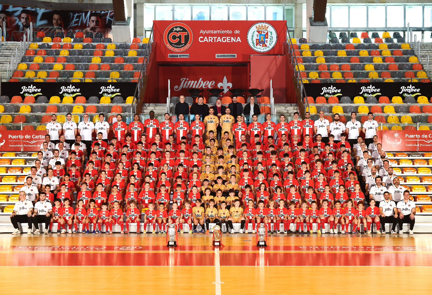 Fotografía de todos los equipos de esta temporada, junto a sus equipos técnicos y la junta directiva, del 'melonero' club del Jimbee FS Cartagena.