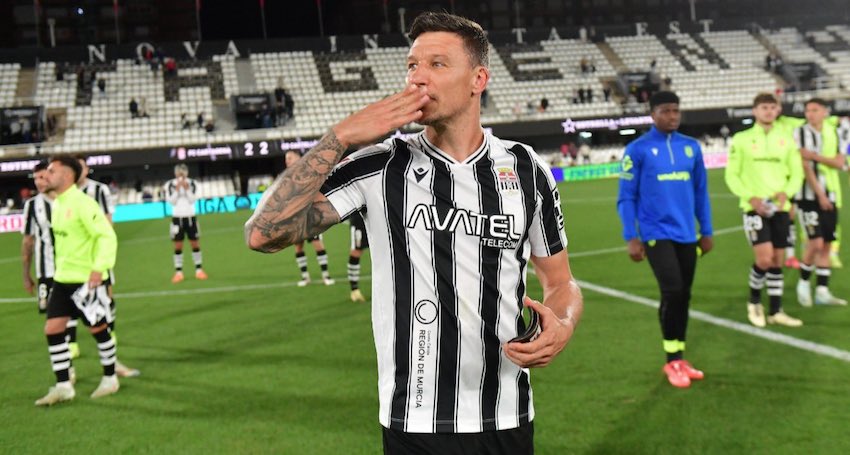 El futbolista, que no estaba bien físicamente, saltó al terreno de juego del partido Cartagena-Castellón en el minuto 83 para despedirse de la (escasa) afición blanquinegra, una vez que ha tomado la decisión de que, con 37 años de edad, quiere regresar a Argentina para 'colgar las botas' en su país natal.