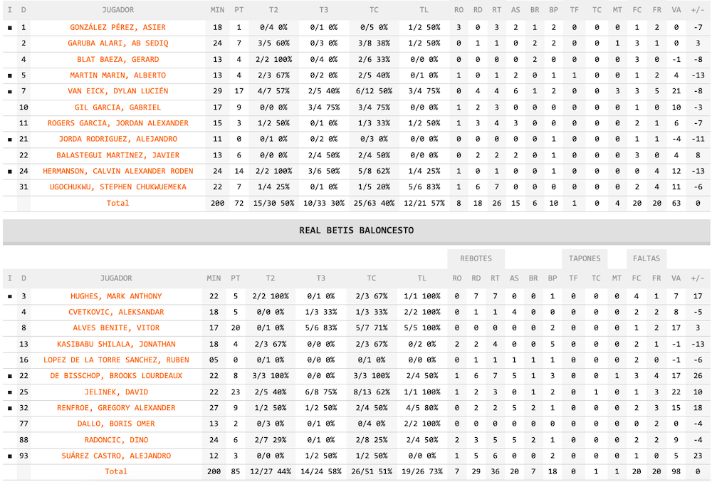 En el capítulo estadístico, reseñar que Dylan (17) y Hermanson (14) fueron los que más puntos firmaron, que en el rebote fue mejor el Betis (36 a 26) y también el triple, pues tiró menos (24 por 33 los locales) para meter más (14 a 10), siendo el porcentaje de acierto del Odilo del 30%, algo menos de un acierto cada tres tiros desde más allá de la línea de 6,25 metros. En faltas, igualdad en los totales de cada equipo.