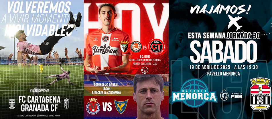 Jimbee FS Cartagena y Odilo FC Cartagena CB juegan esta tarde sus compromisos de liga. El equipo de fútbol sala visita hoy al Ribera Navarra en Tudela y el de baloncesto pisará pista en Menorca. Ambos quieren volver entrar en el camino de las victorias. Por su parte, el ya descendido FC Cartagena recibe el domingo al Granada CF y pesumiblemente el Cartagonova acoja más aficionados visitantes que locales. También en fútbol, la Minera buscará en Murcia zanjar el mínimo riesgo de descenso que aún le acecha.