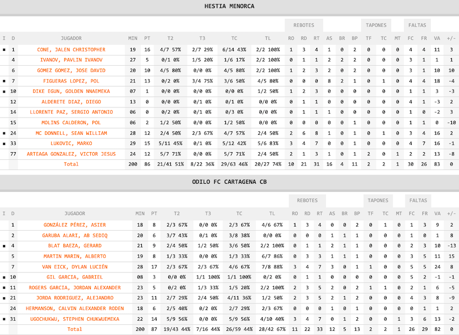 Destacar que el Odilo dominó el rebote en este partido (33 capturas por 31 del rival) salvo en el último cuarto, lo que resultó importante, pues en esos diez minutos sólo cogió un rebote por diez su adversario. Otro factor de la reacción local fue que en esta recta final tuvo un acierto en el triple (tres aciertos) que no había tenido antes. Por cierto, en los lanzamientos lejanos bajó la cifra de intentos (16) del cuadro cartagenero y subió el porcentaje de acierto (7 anotados para un 44%) con respecto a las jornadas precedentes. El mejor artillero fue Dylan (17), seguido por 'Ugo' (14) y Álex Jordá (11).