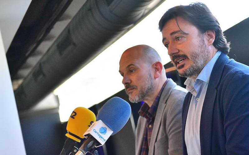 La asamblea de la Federación Española de Baloncesto aprobó las bases y fechas de la nueva temporada de Primera FEB, en la que el Club Basket Cartagena (Odilo FC Cartagena CB esta campaña) competirá por segunda vez en su historia y tras su brillante papel en el ejercicio de su estreno. En la foto, de izquierda a derecha, el director deportivo (Pepe García) y el presidente (David Ayala)