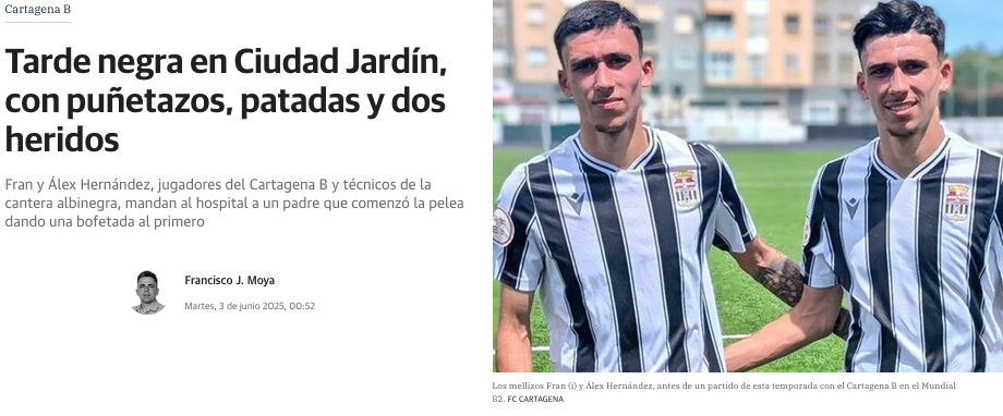 El campo de Ciudad Jardín acogió ayer el lamentable incidente de un incidiente, donde, según desvela el diario de La Verdad, el padre de un jugador dio una bofetada a un técnico del equipo de su hijo, quien después, junto a su hermano, le dieron una paliza, por la que tuvo que ser trasladado al hospital. Los entrenadores son Fran y Álex Hernández, jugadores también del Cartagena B. Ambas partes se han denunciado en Comisaría y el club albinegro abre expediente y anuncia expulsiones.