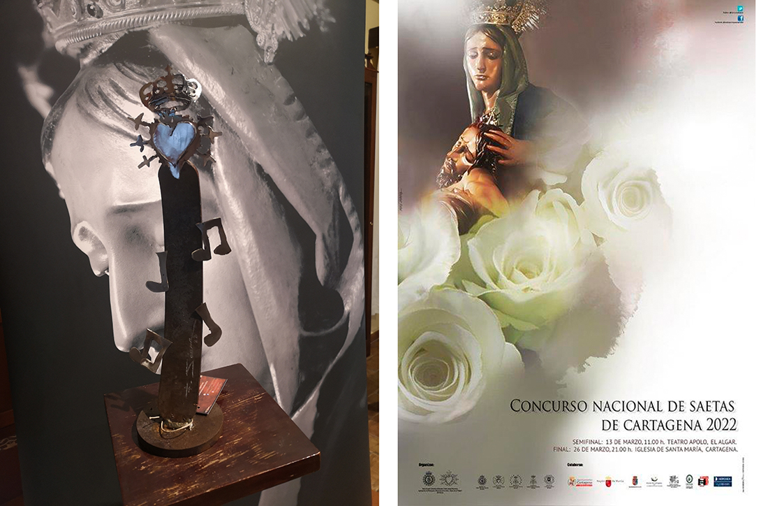 El escultor Fernando Saénz de Elorrieta ha mostrado al público asistente la escultura-trofeo que recibirá el ganador de esta edición del concurso de saetas. “Esta escultura representa la vara que llevamos los portapasos como símbolo de unión con La Piedad, acompañada de las notas musicales como reflejo de esa oración cantada que es la saeta” nos explica Saénz de Elorrieta.
