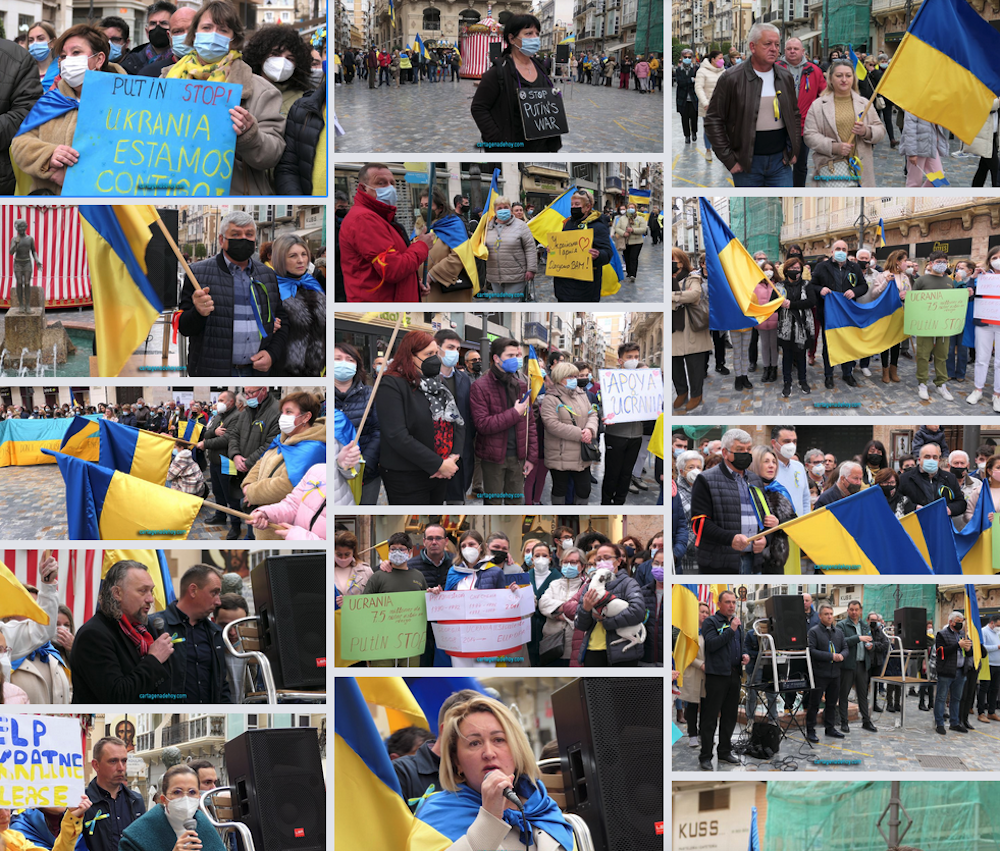 El acto, entre numerosas banderas ucranianas y una de España, ha comenzado con el sonido por megafonía de emblemáticos temas musicales de Ucrania, incluido su himno. En el capítulo de alocuciones, las primeras personas en intervenir lo han hecho en su lengua natal, para después coger protagonismo las exposiciones en español. Estas intervenciones se pueden escuchar en el vídeo adjunto, pero entre ellas destacamos dos capítulos. Uno es el humanitario, en el que se pide el apoyo a la sociedad cartagenera para ayudar, siendo dos las fórmulas. Una es prepararse para la acogida de refugiados y la otra, aportando alimentos y medicinas para enviar a Ucrania. La recogida de esto último comenzó ayer y continuará el próximo sábado. También se facilitará un número de cuenta bancaria para los que quieren aportar dinero.