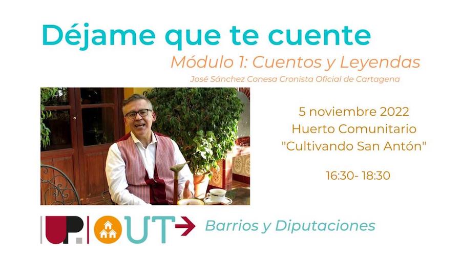 La Universidad Popular inició en Nueva Cartagena el ciclo ‘Déjame que te cuente - Módulo 1: cuentos y leyendas’, que está ofreciendo el palmesano José Sánchez Conesa, integrante del equipo de cronistas oficiales de Cartagena. Hoy estará en el huerto comunitario ‘Cultivando San Antón’ (de 16.30 horas) y en salón social de Tallante (19 horas), ambos con entrada gratuita, que estarán centradas, por las fechas, en tradiciones de ánimas y sus paralelismos con la anglosajona fiesta que tanto se ha popularizado.