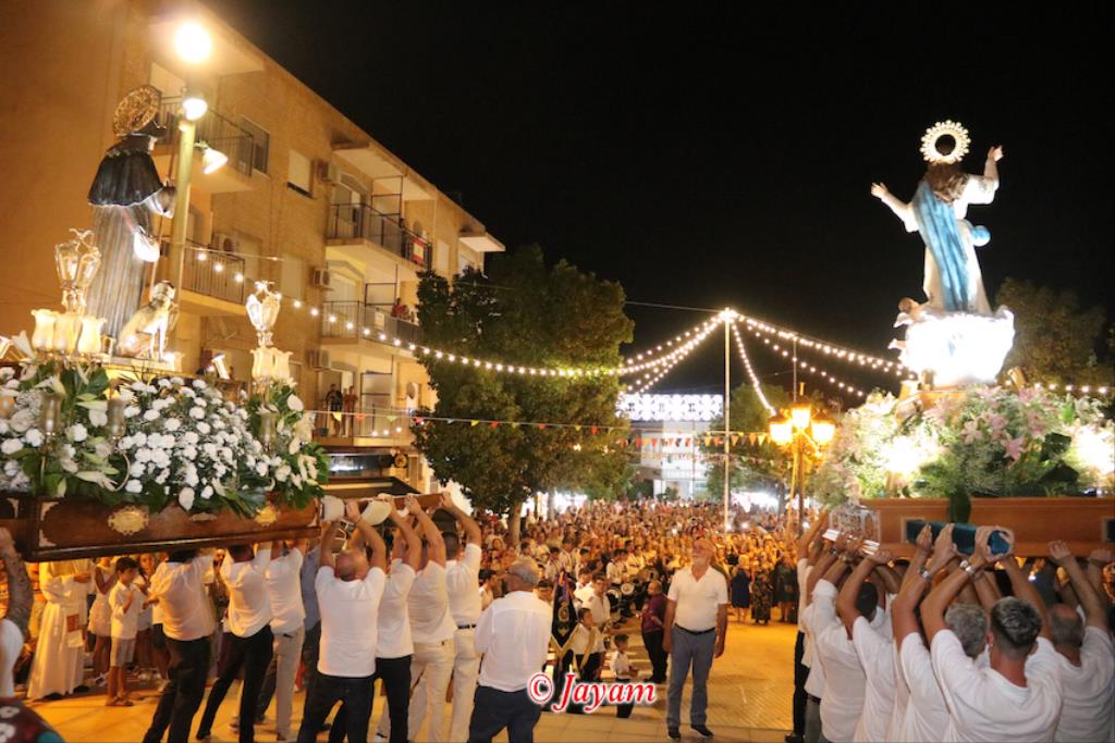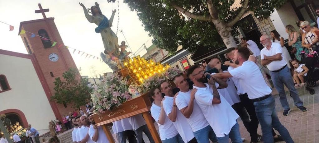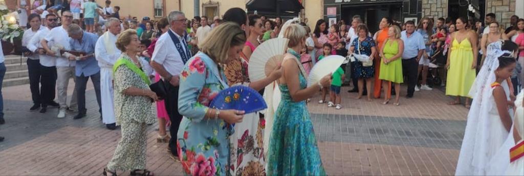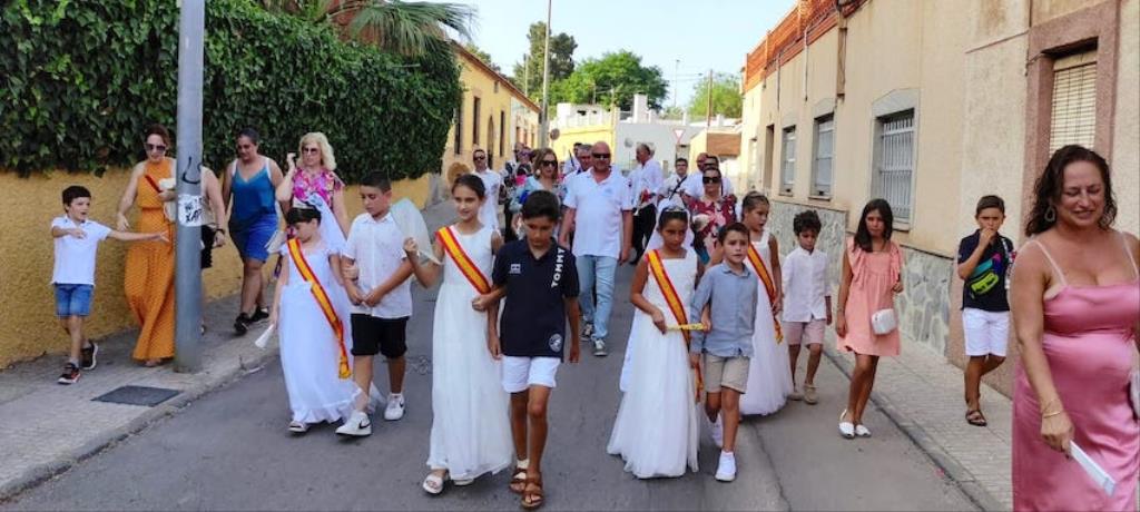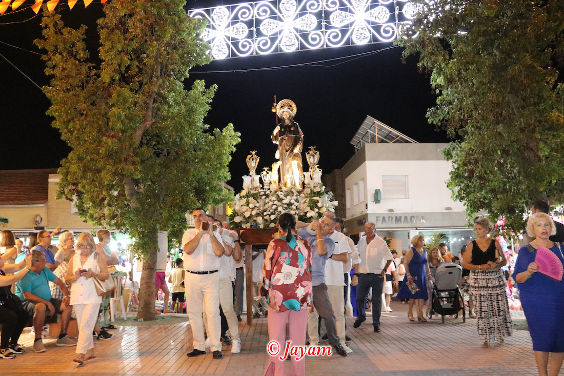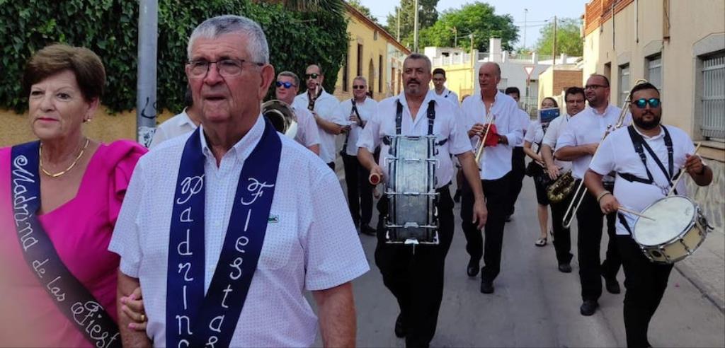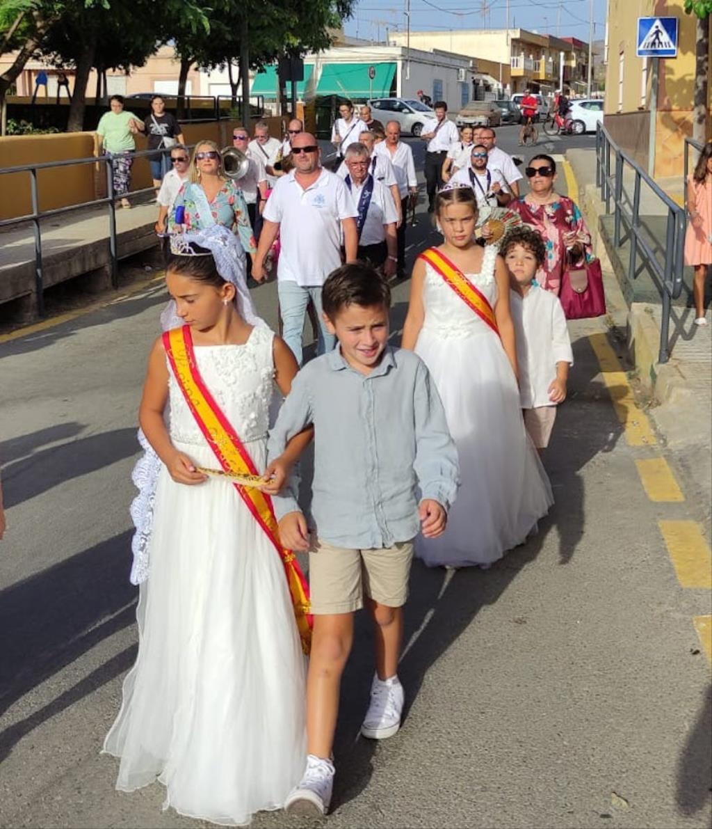 La charanga de la Agrupación Musical ‘Cartagena 1990’ puso la animación en el pasacalles de recogida de reinas, mises y padrinos por el pueblo, alcanzando después la iglesia, donde se celebró una misa solemne en honor al patrón, que fue oficiada por Andrés Vera y que contó, entre los asistentes, con los concejales Paqui Martínez Sotomayor, Jesús Giménez y Enrique Pérez Abellán. A su conclusión, comenzó la procesión. Primero fue la Virgen de la Asunción la que cruzó el pórtico de la parroquia y se asomó al exterior, recibiendo vivas que continuaron cuando fue San Roque el que se ubicó en lo alto de la escalinata.