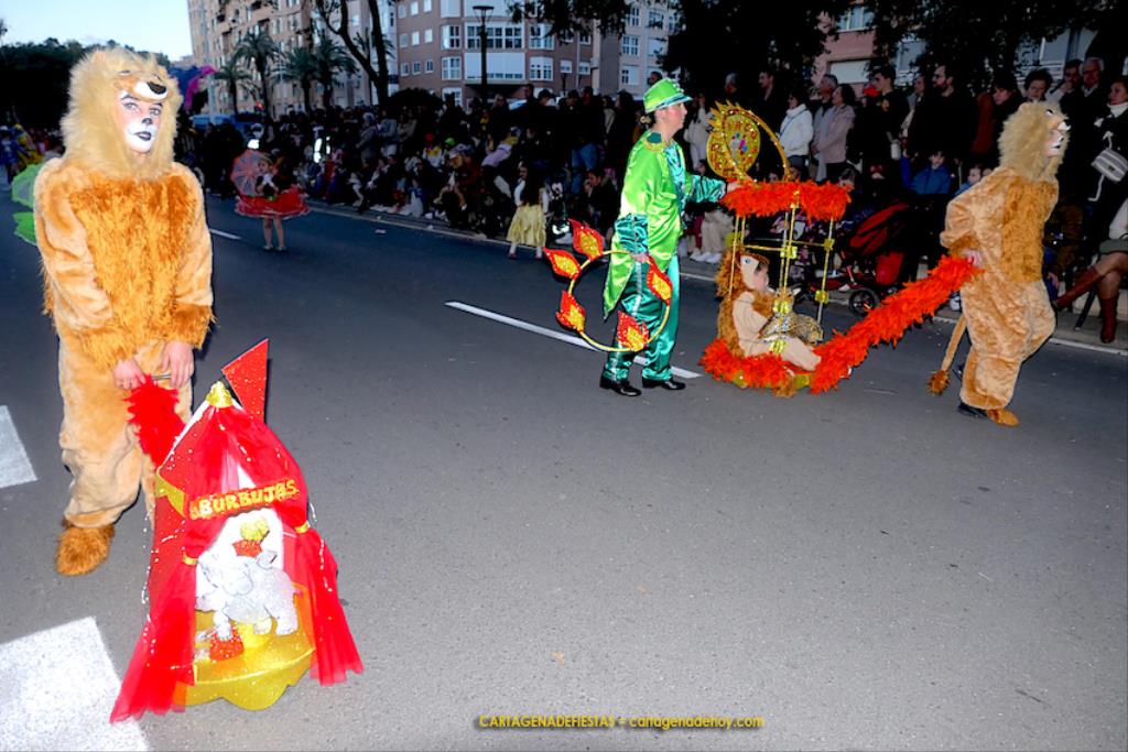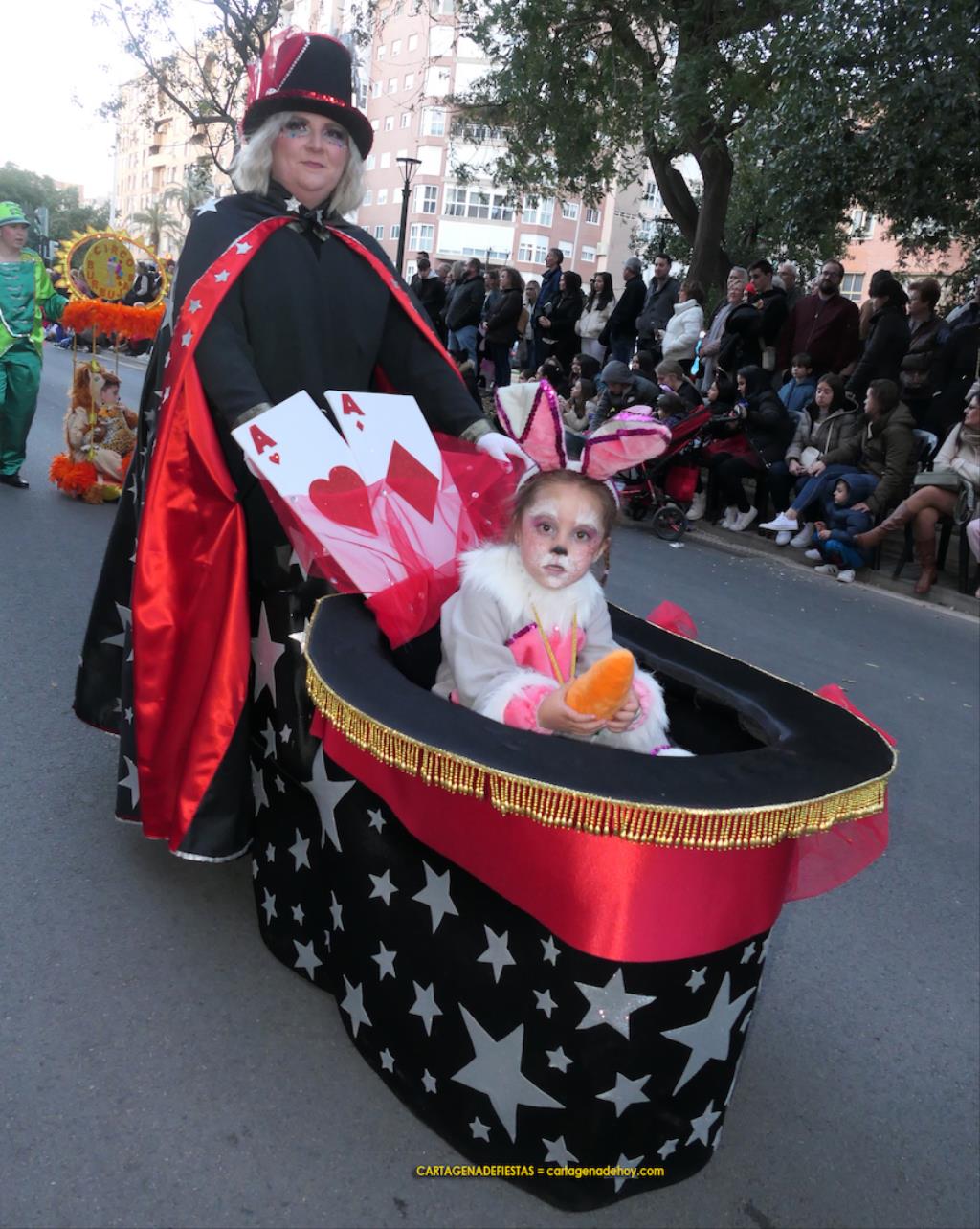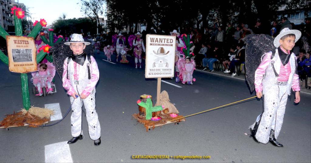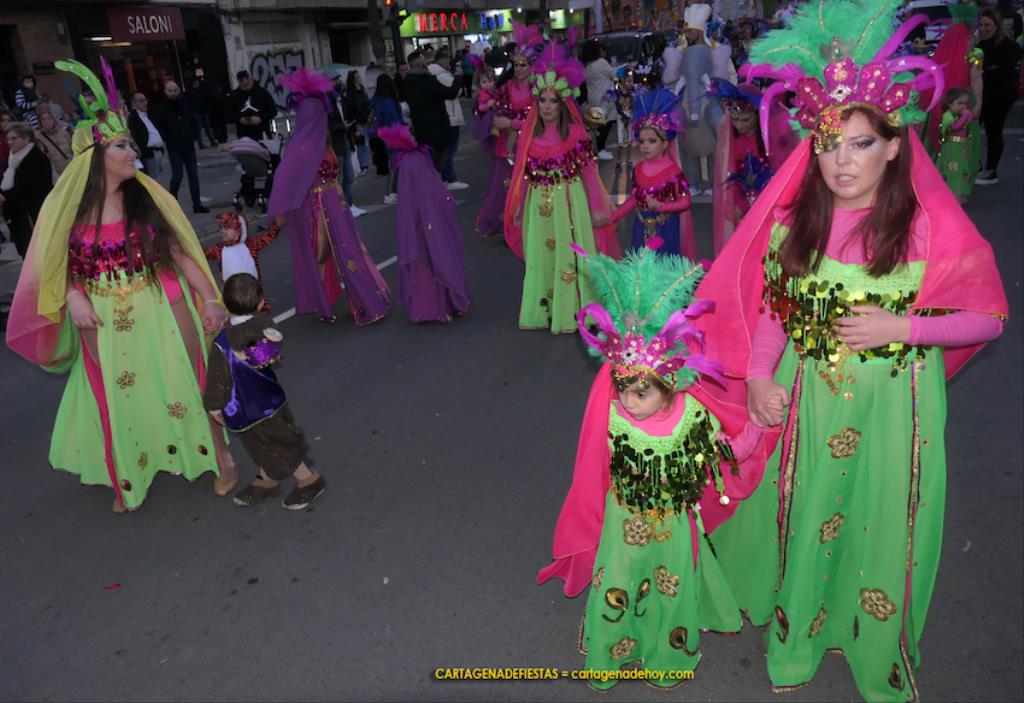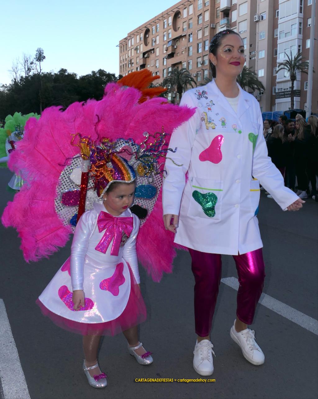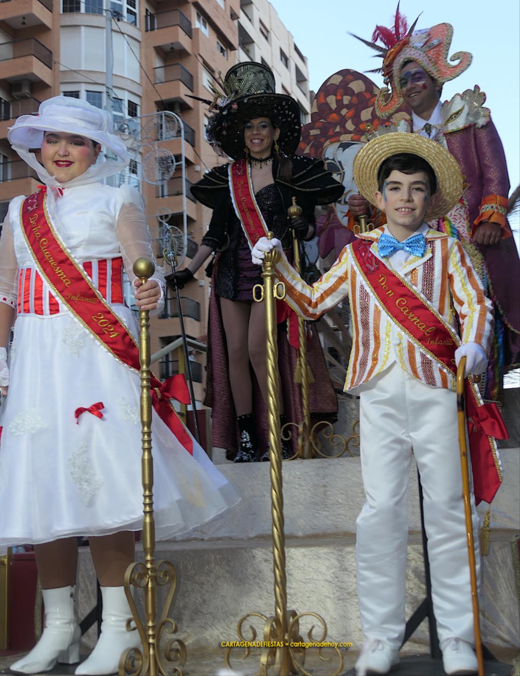 El desfile lo abrían colectivos no carnavaleros, pero habituales al desfile, como Viva Gym y los scout de Inhala Panzy de Canteras, dando paso a la carroza de la doble versión (adulta e infantil) de Don Carnal y Doña Cuaresma. A continuación las entrañables comparsas infantiles, donde muchos integrantes desmuestran ya sus ilusión por esta fiesta. Siguieron los mayores con variados disfraces, desde 'Barbie' hasta los protagonistas de 'Lo que el viento se llevó' (Barriada Virgen de la Caridad), cerrando la carroza con los reyes de este año, surgidos de La Manga.