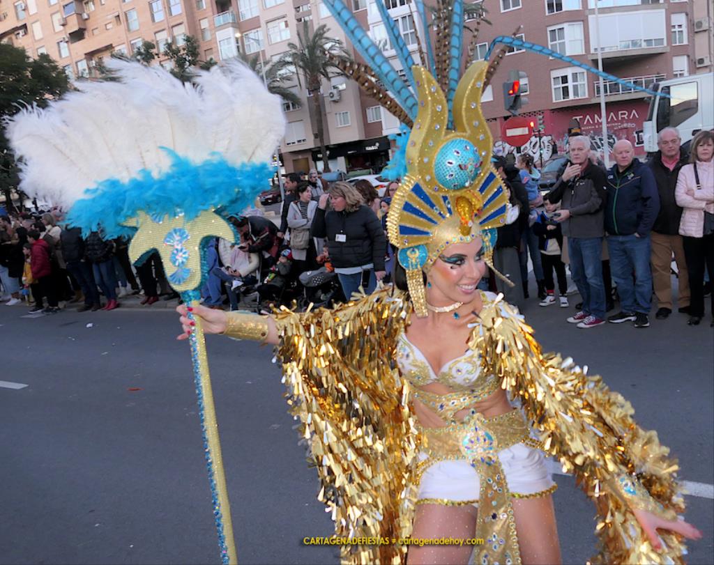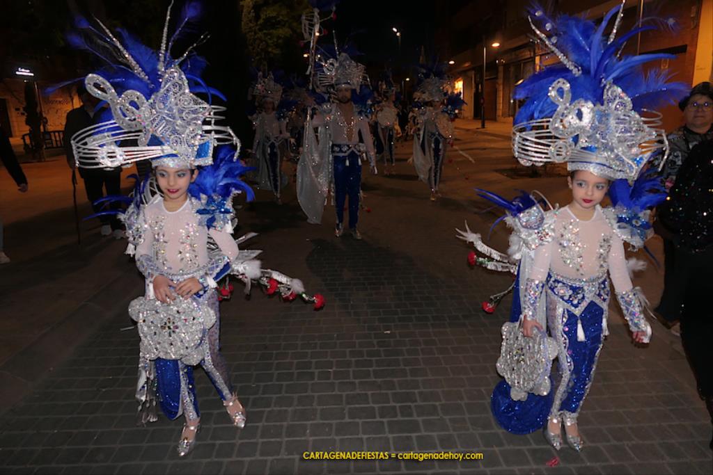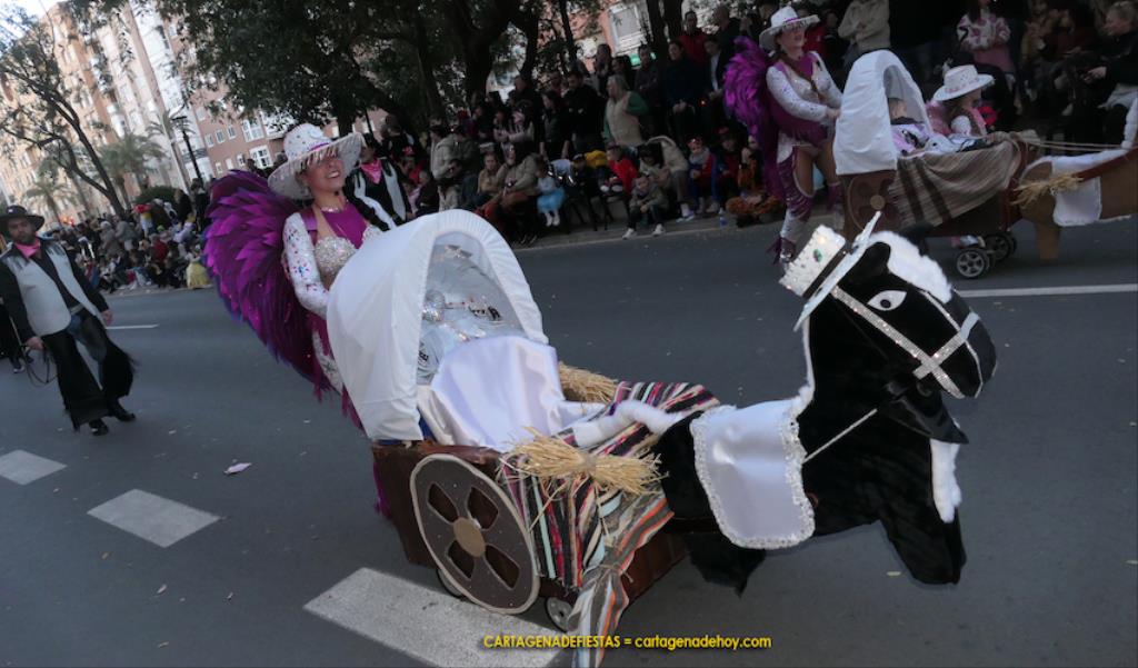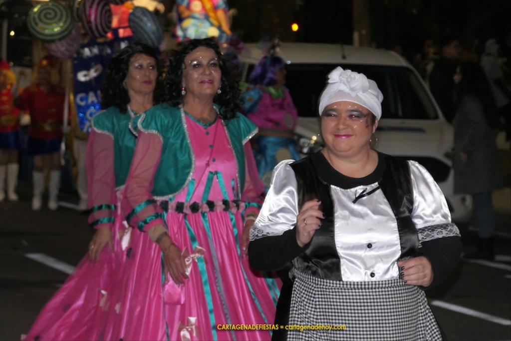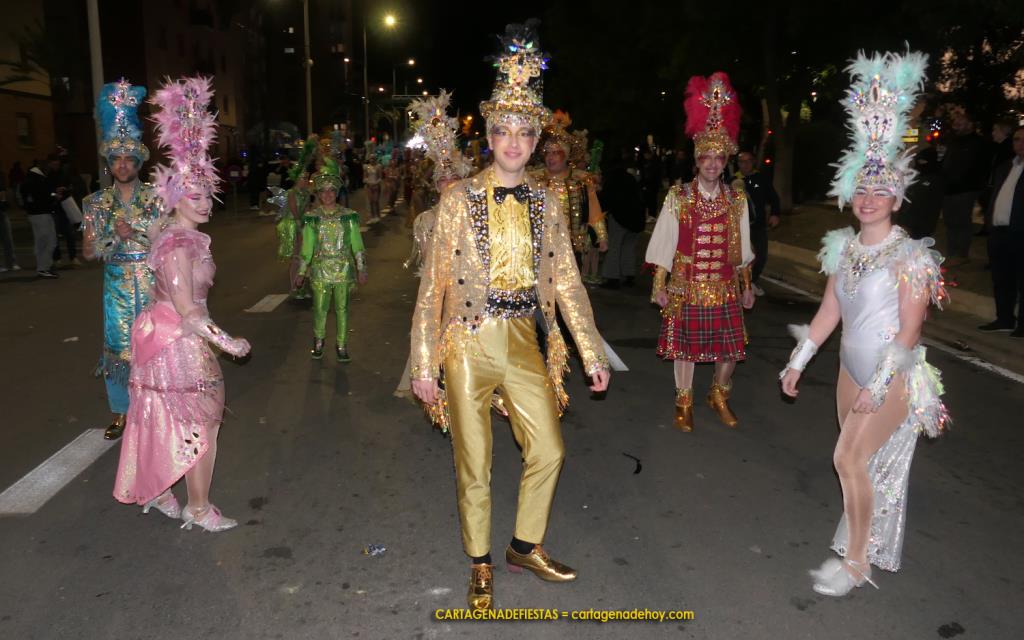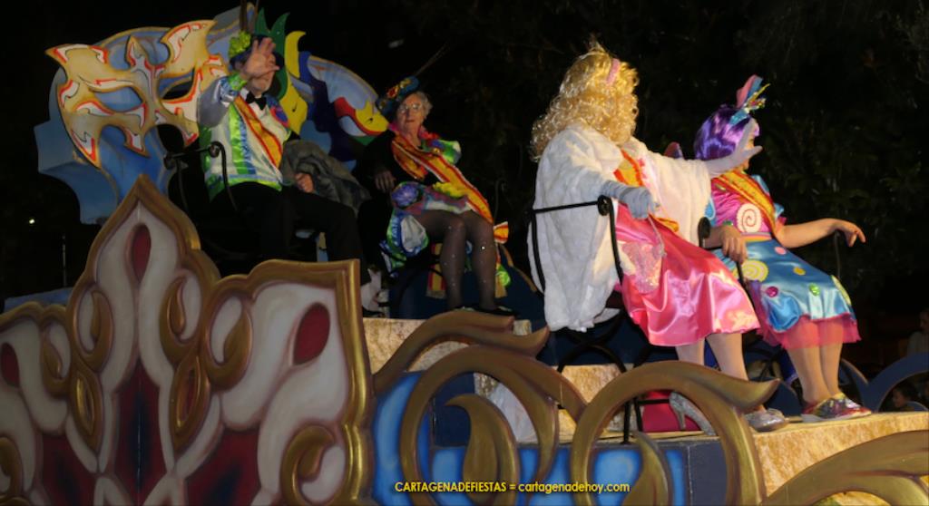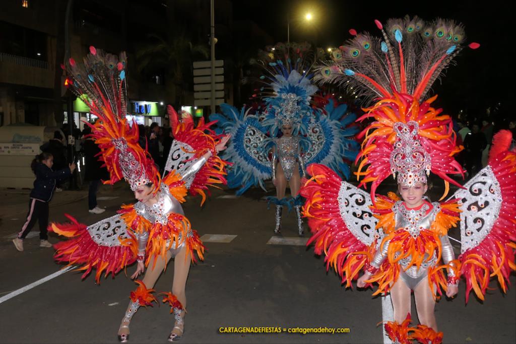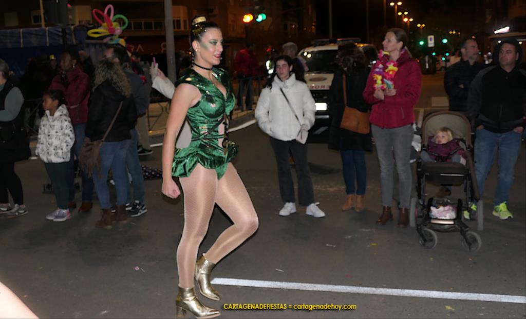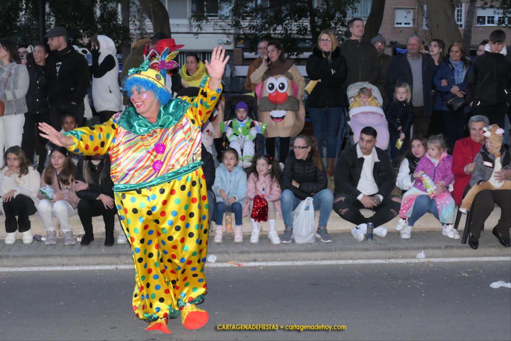 El desfile lo abrían colectivos no carnavaleros, pero habituales al desfile, como Viva Gym y los scout de Inhala Panzy de Canteras, dando paso a la carroza de la doble versión (adulta e infantil) de Don Carnal y Doña Cuaresma. A continuación las entrañables comparsas infantiles, donde muchos integrantes desmuestran ya sus ilusión por esta fiesta. Siguieron los mayores con variados disfraces, desde 'Barbie' hasta los protagonistas de 'Lo que el viento se llevó' (Barriada Virgen de la Caridad), cerrando la carroza con los reyes de este año, surgidos de La Manga.