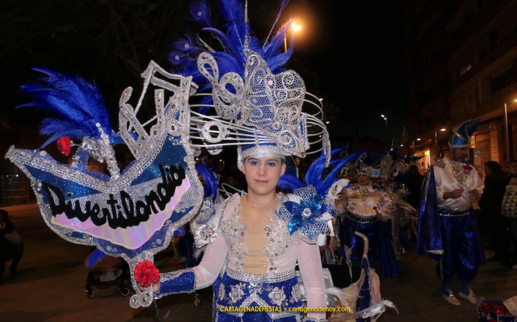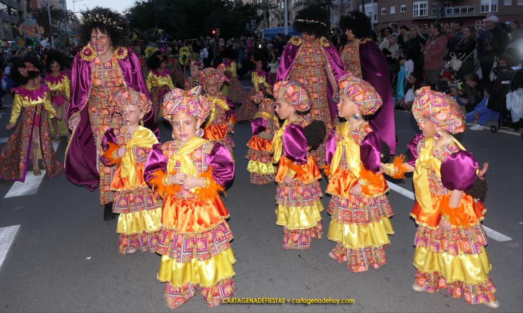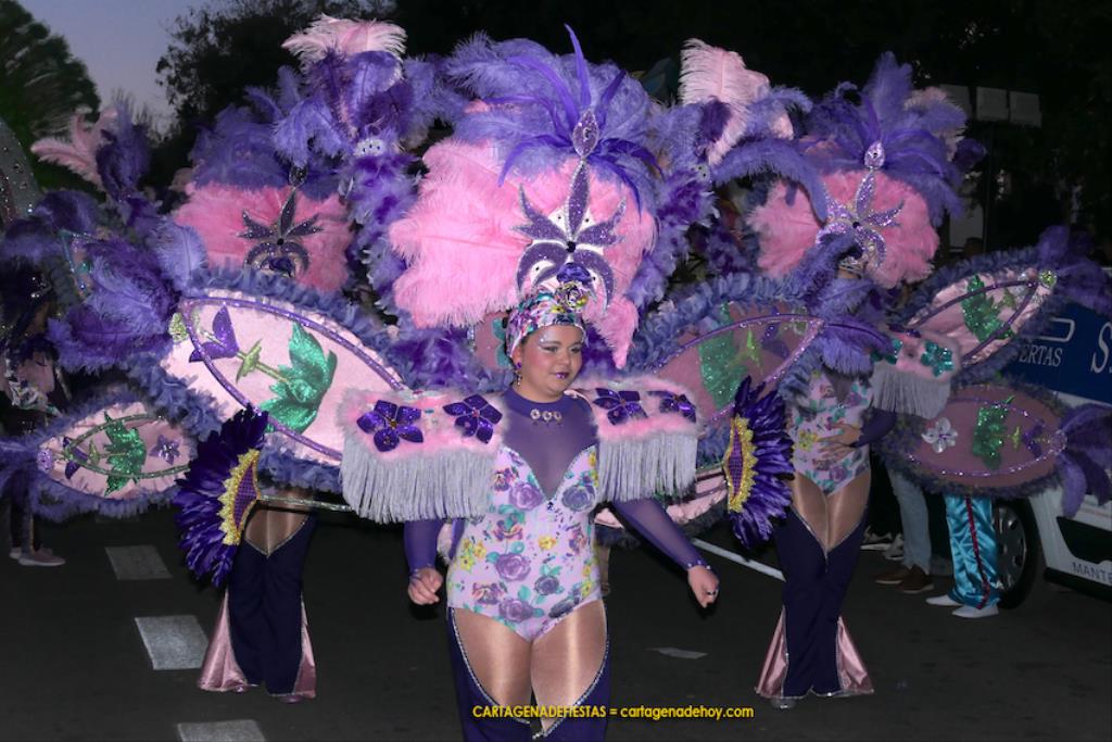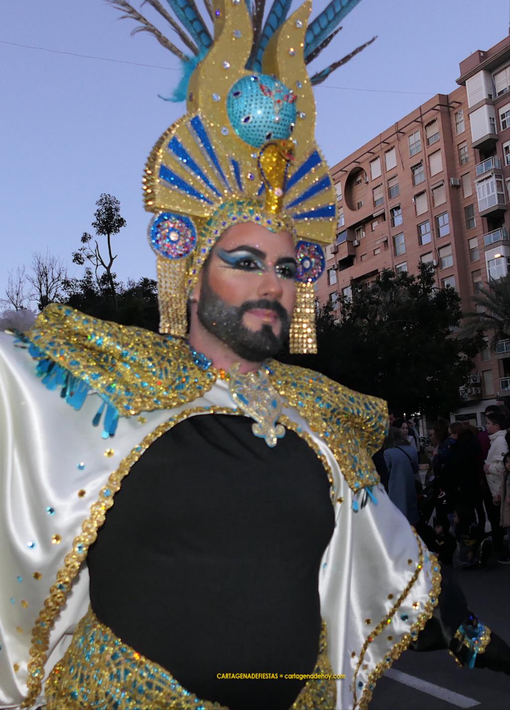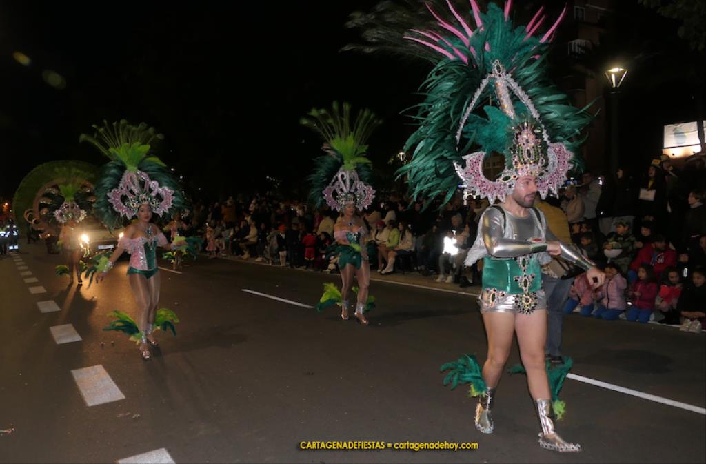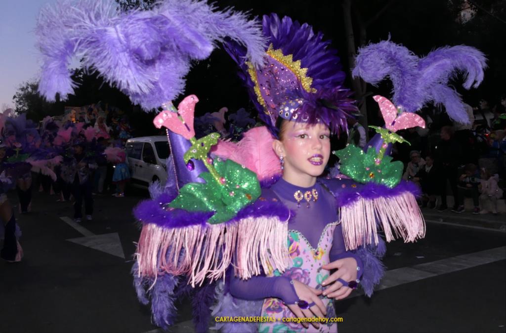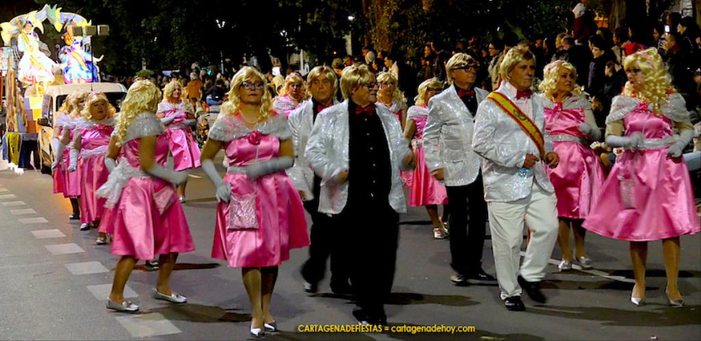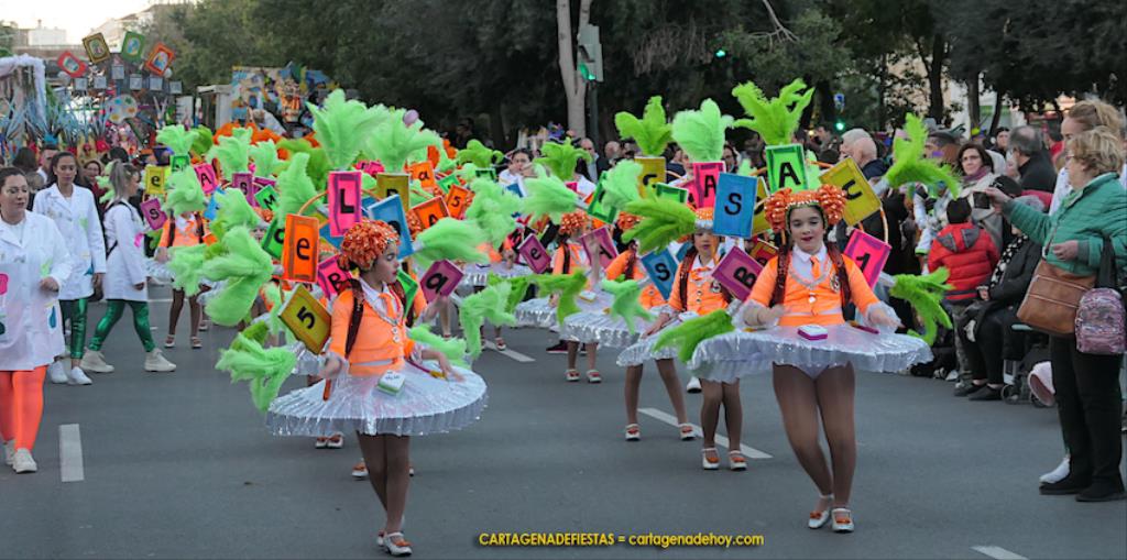 El desfile lo abrían colectivos no carnavaleros, pero habituales al desfile, como Viva Gym y los scout de Inhala Panzy de Canteras, dando paso a la carroza de la doble versión (adulta e infantil) de Don Carnal y Doña Cuaresma. A continuación las entrañables comparsas infantiles, donde muchos integrantes desmuestran ya sus ilusión por esta fiesta. Siguieron los mayores con variados disfraces, desde 'Barbie' hasta los protagonistas de 'Lo que el viento se llevó' (Barriada Virgen de la Caridad), cerrando la carroza con los reyes de este año, surgidos de La Manga.