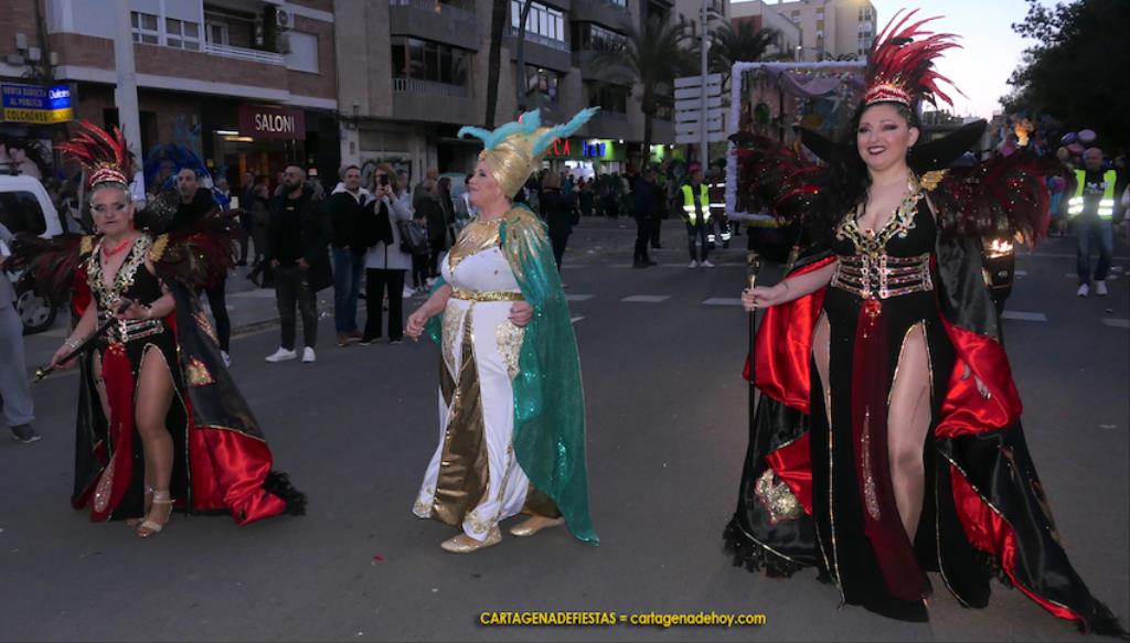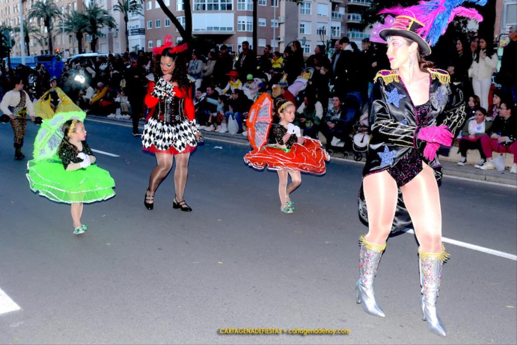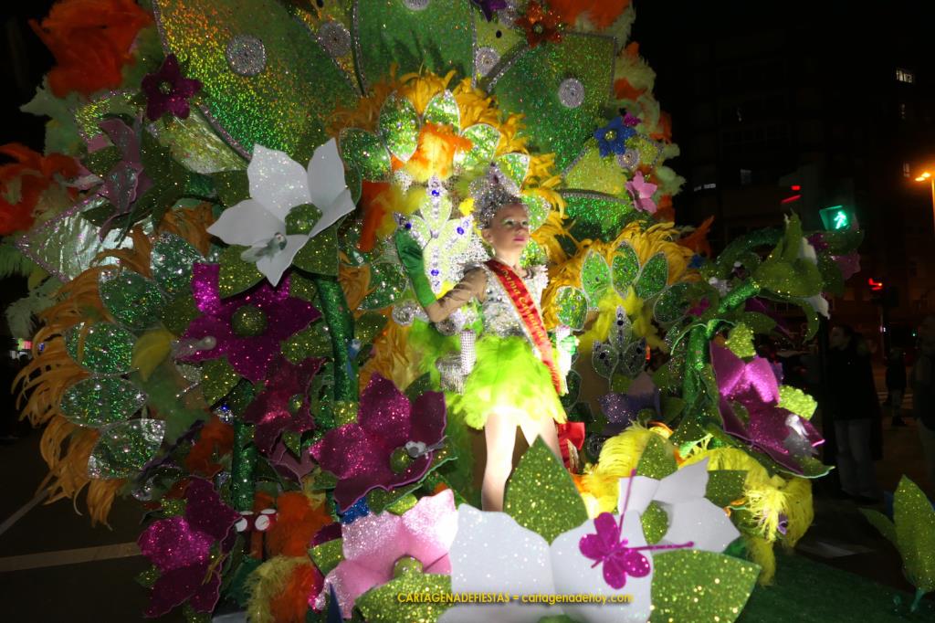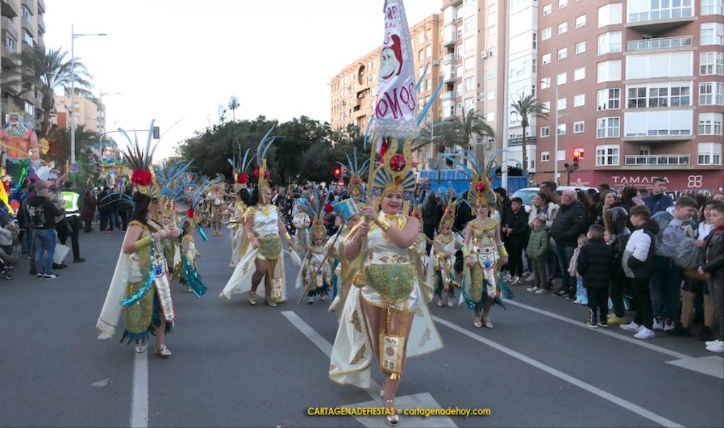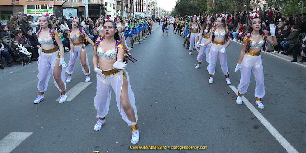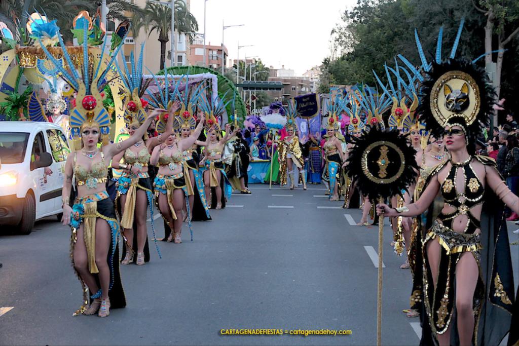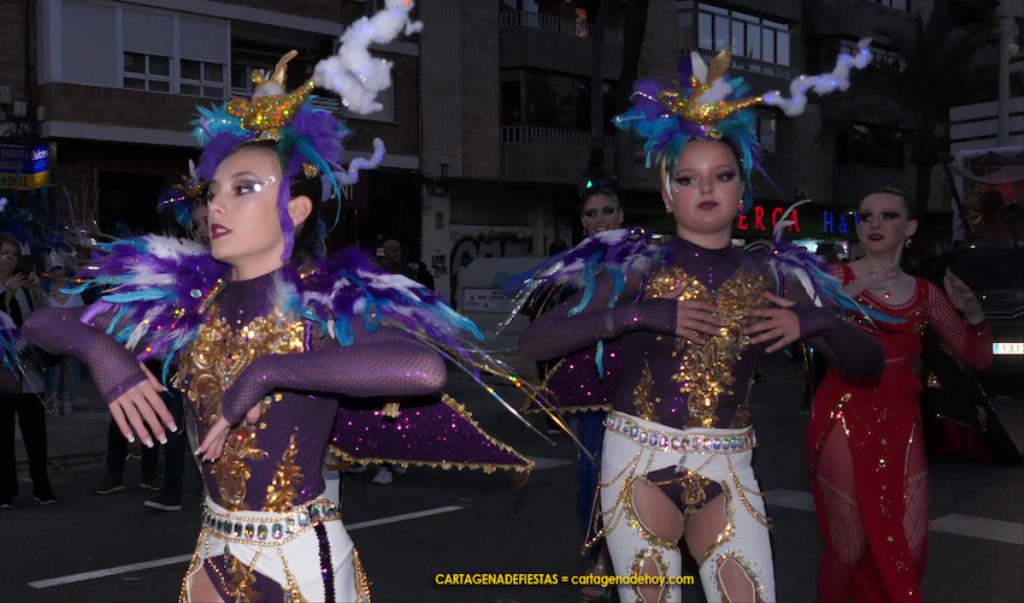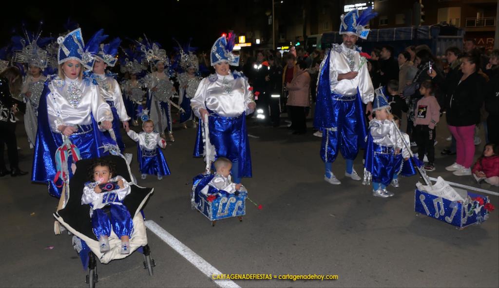 El desfile lo abrían colectivos no carnavaleros, pero habituales al desfile, como Viva Gym y los scout de Inhala Panzy de Canteras, dando paso a la carroza de la doble versión (adulta e infantil) de Don Carnal y Doña Cuaresma. A continuación las entrañables comparsas infantiles, donde muchos integrantes desmuestran ya sus ilusión por esta fiesta. Siguieron los mayores con variados disfraces, desde 'Barbie' hasta los protagonistas de 'Lo que el viento se llevó' (Barriada Virgen de la Caridad), cerrando la carroza con los reyes de este año, surgidos de La Manga.