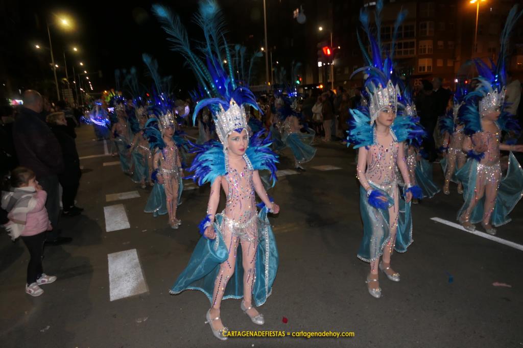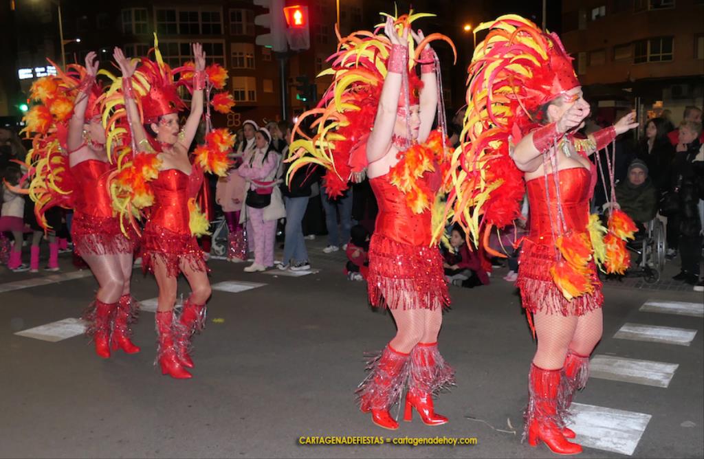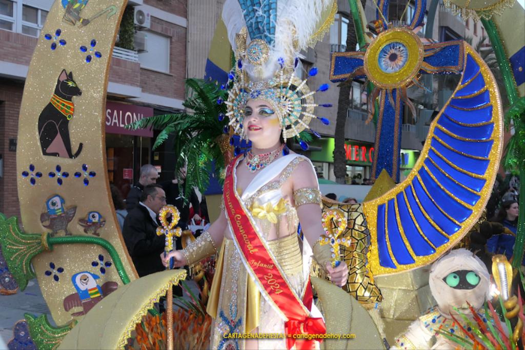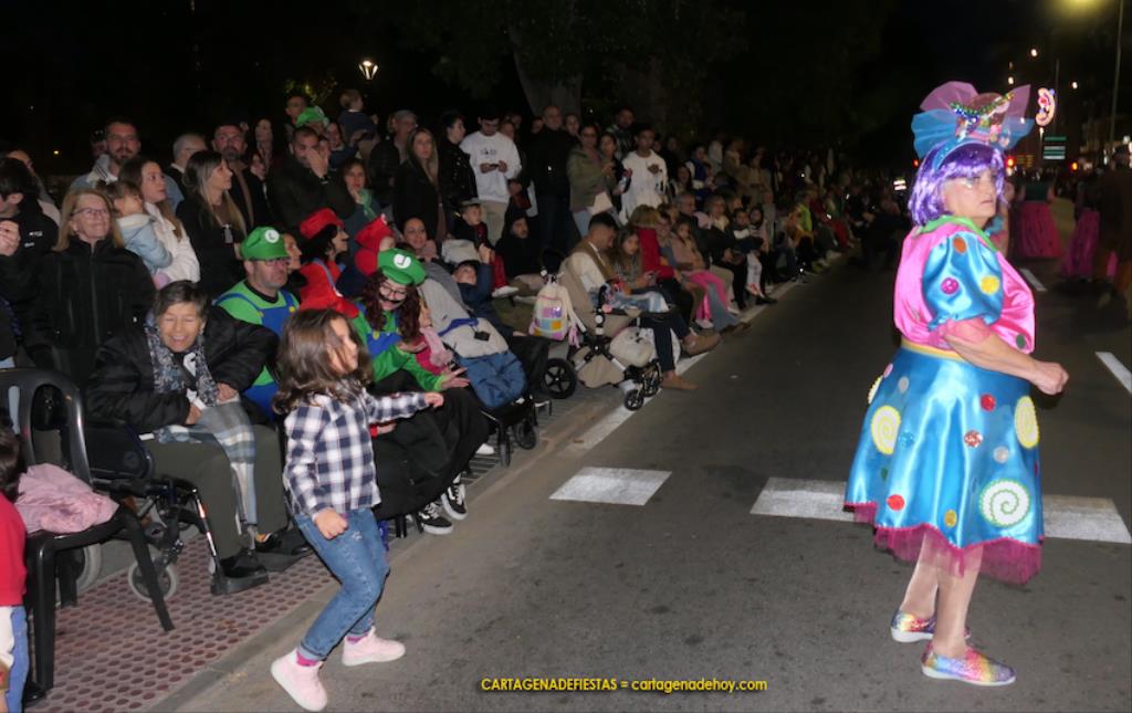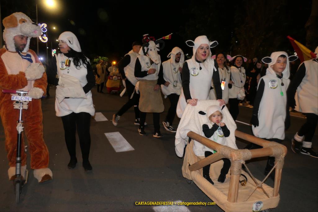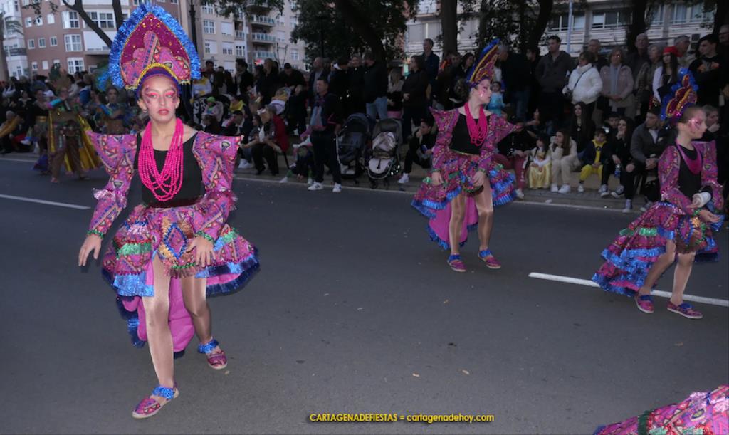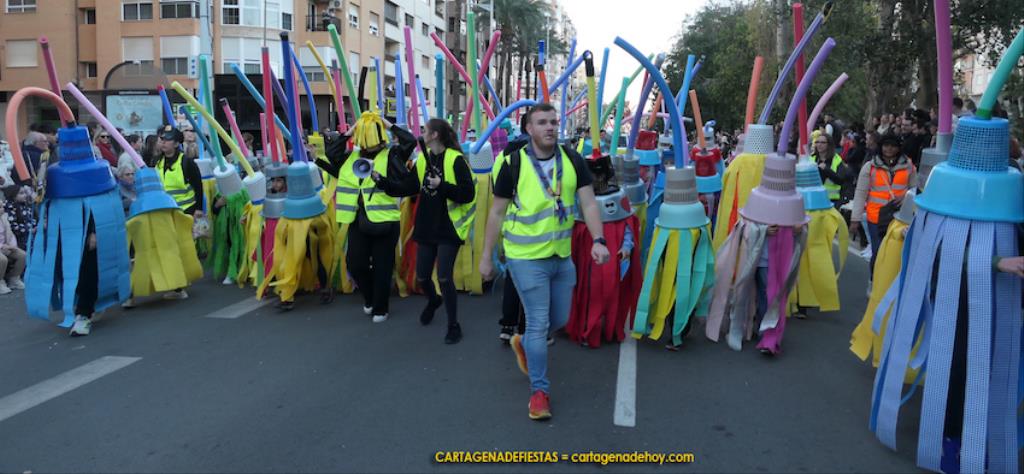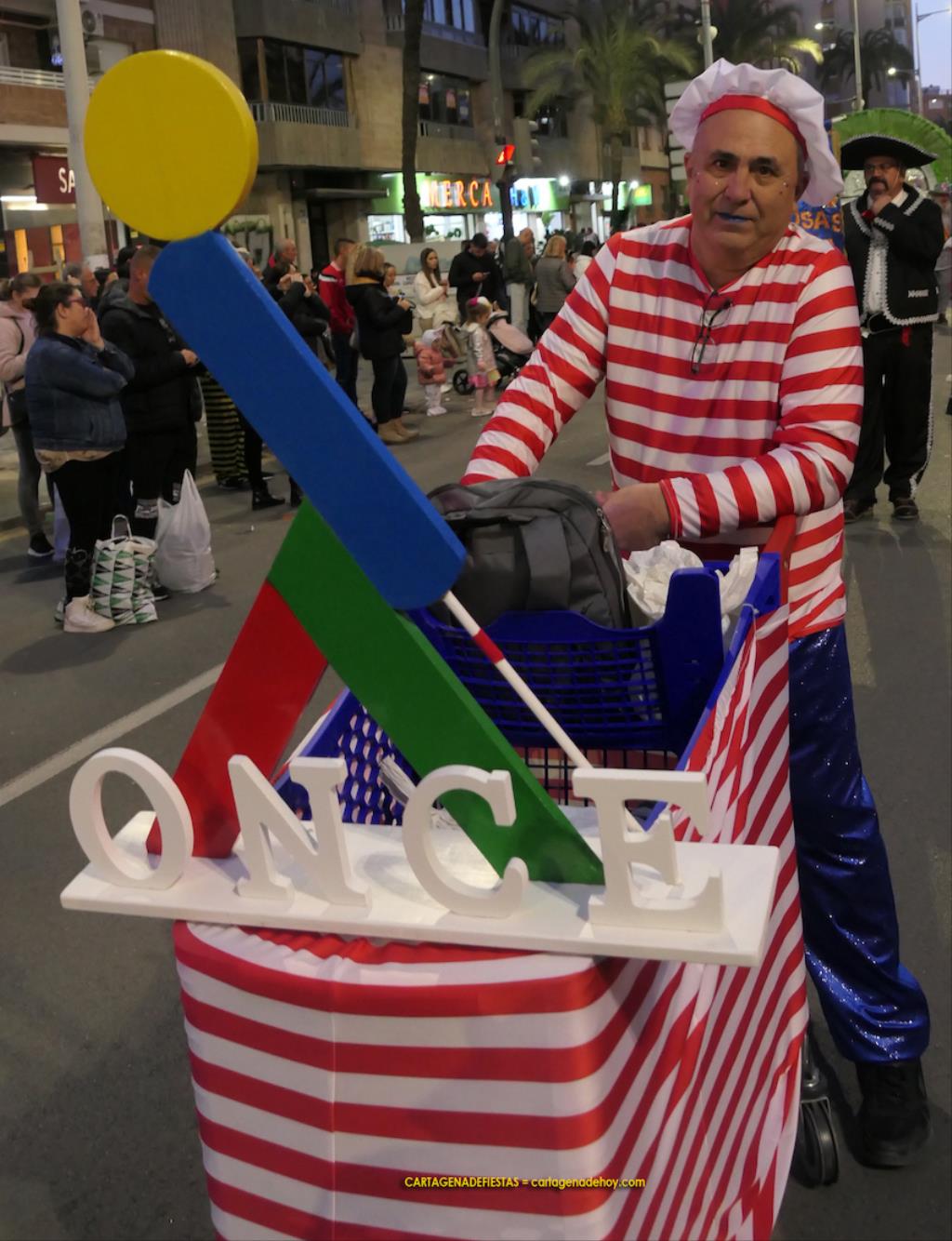El desfile lo abrían colectivos no carnavaleros, pero habituales al desfile, como Viva Gym y los scout de Inhala Panzy de Canteras, dando paso a la carroza de la doble versión (adulta e infantil) de Don Carnal y Doña Cuaresma. A continuación las entrañables comparsas infantiles, donde muchos integrantes desmuestran ya sus ilusión por esta fiesta. Siguieron los mayores con variados disfraces, desde 'Barbie' hasta los protagonistas de 'Lo que el viento se llevó' (Barriada Virgen de la Caridad), cerrando la carroza con los reyes de este año, surgidos de La Manga.