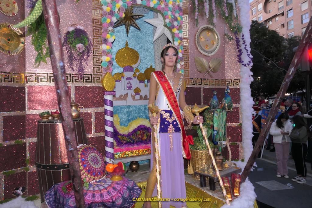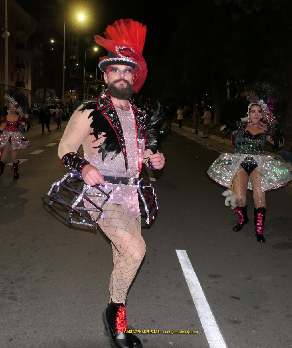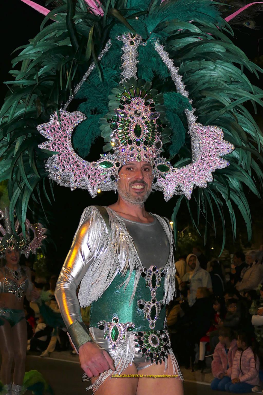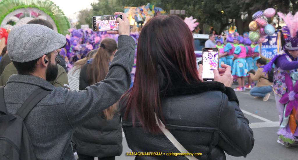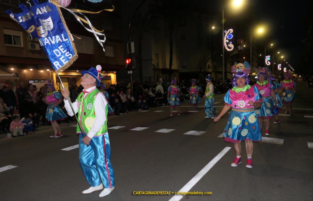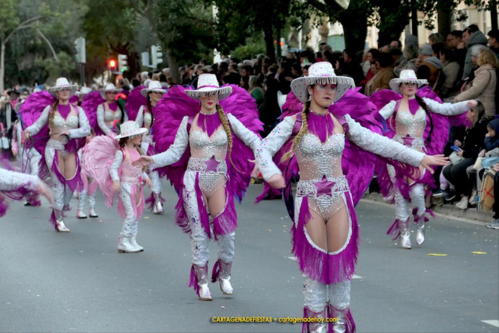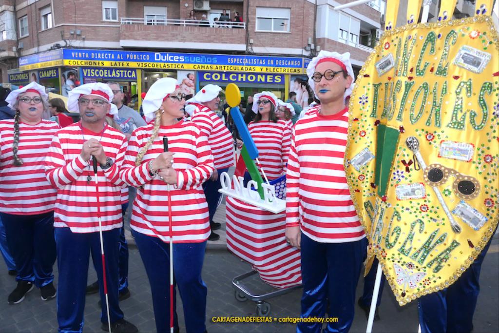 El desfile lo abrían colectivos no carnavaleros, pero habituales al desfile, como Viva Gym y los scout de Inhala Panzy de Canteras, dando paso a la carroza de la doble versión (adulta e infantil) de Don Carnal y Doña Cuaresma. A continuación las entrañables comparsas infantiles, donde muchos integrantes desmuestran ya sus ilusión por esta fiesta. Siguieron los mayores con variados disfraces, desde 'Barbie' hasta los protagonistas de 'Lo que el viento se llevó' (Barriada Virgen de la Caridad), cerrando la carroza con los reyes de este año, surgidos de La Manga.