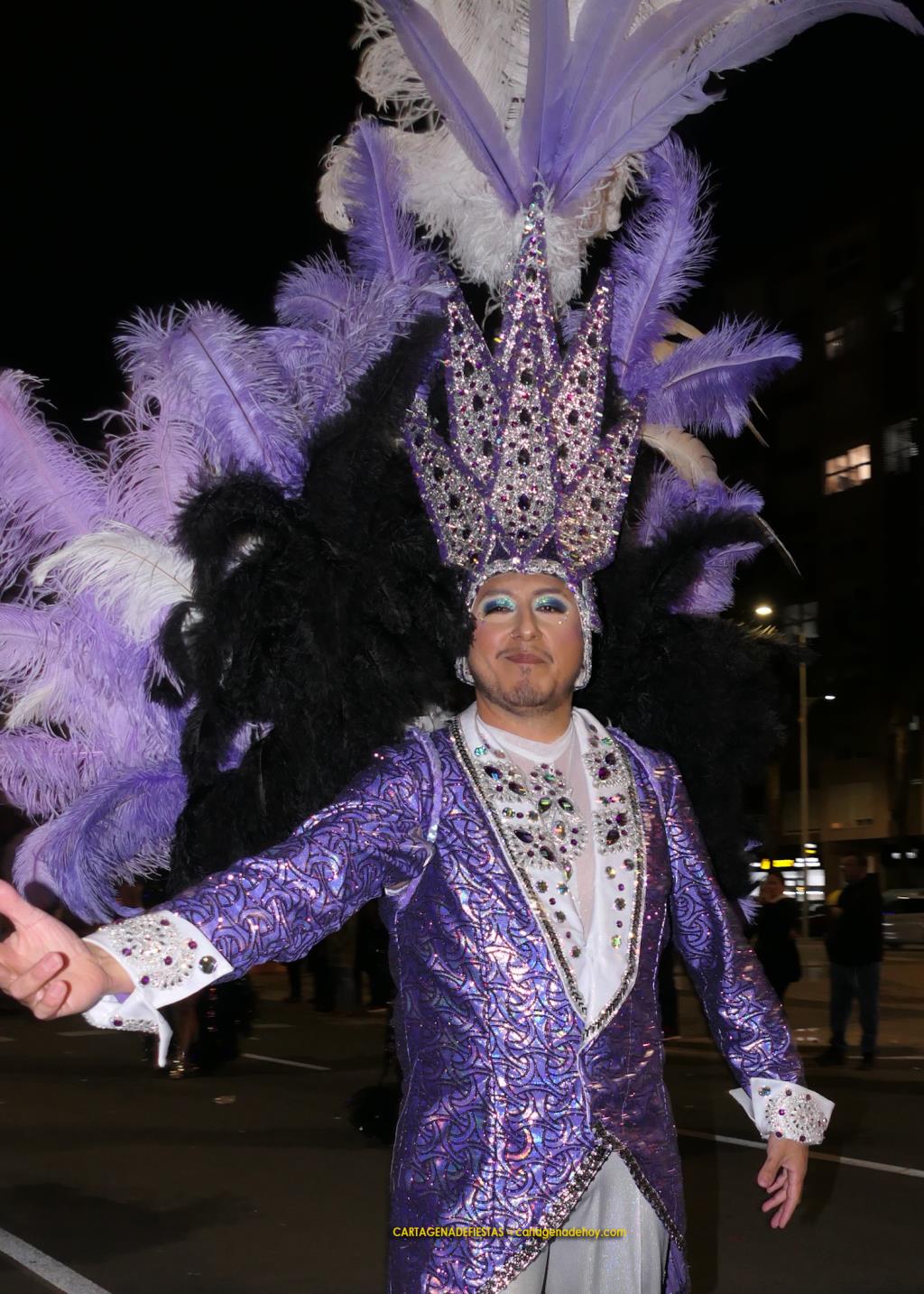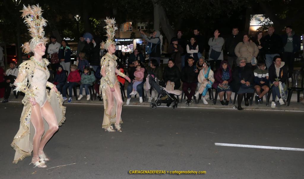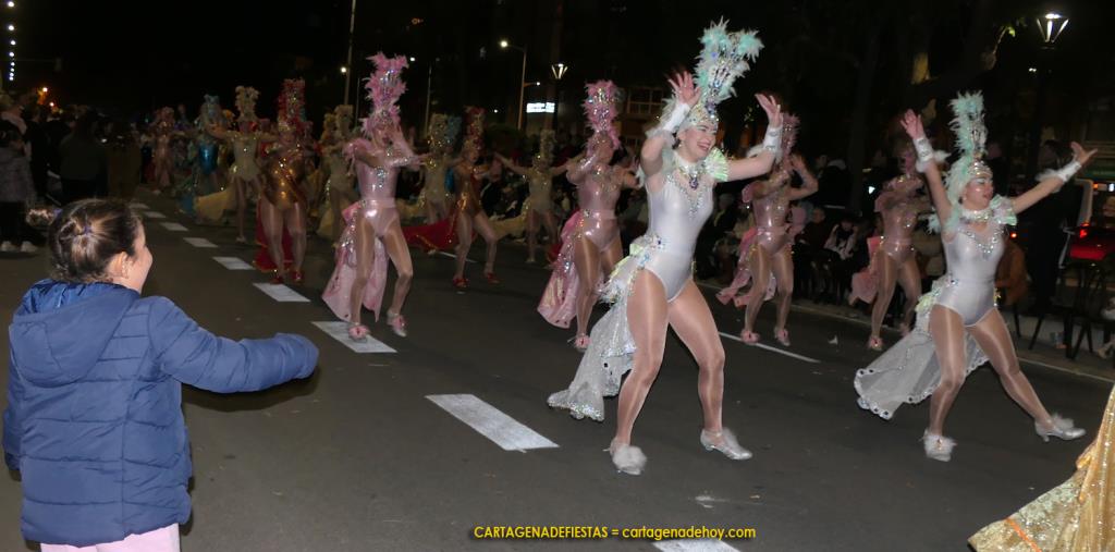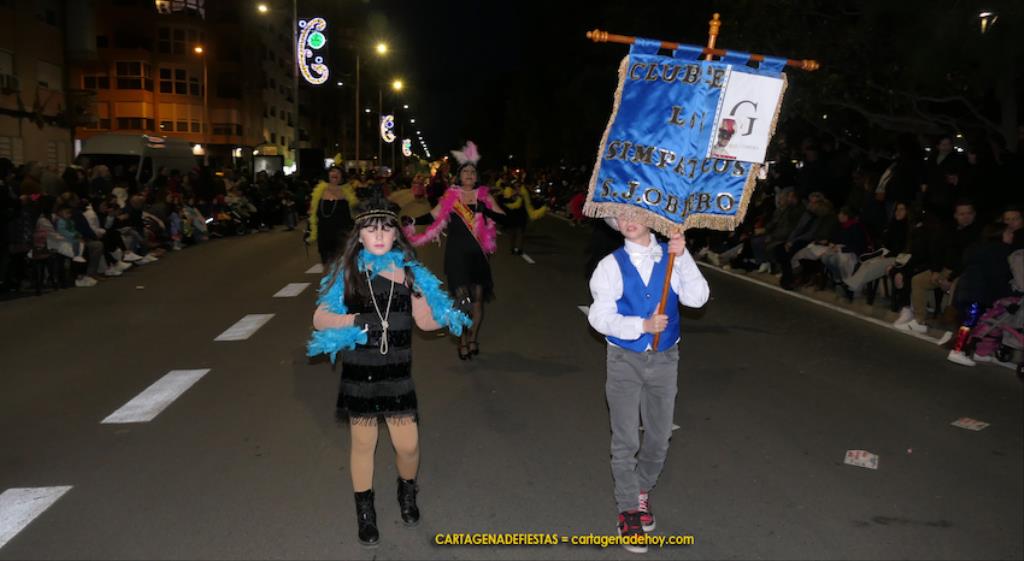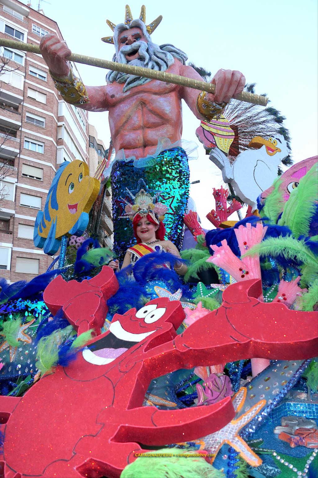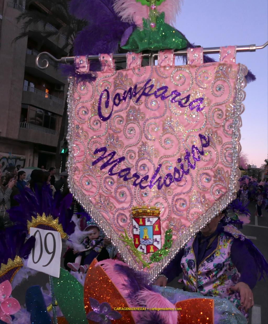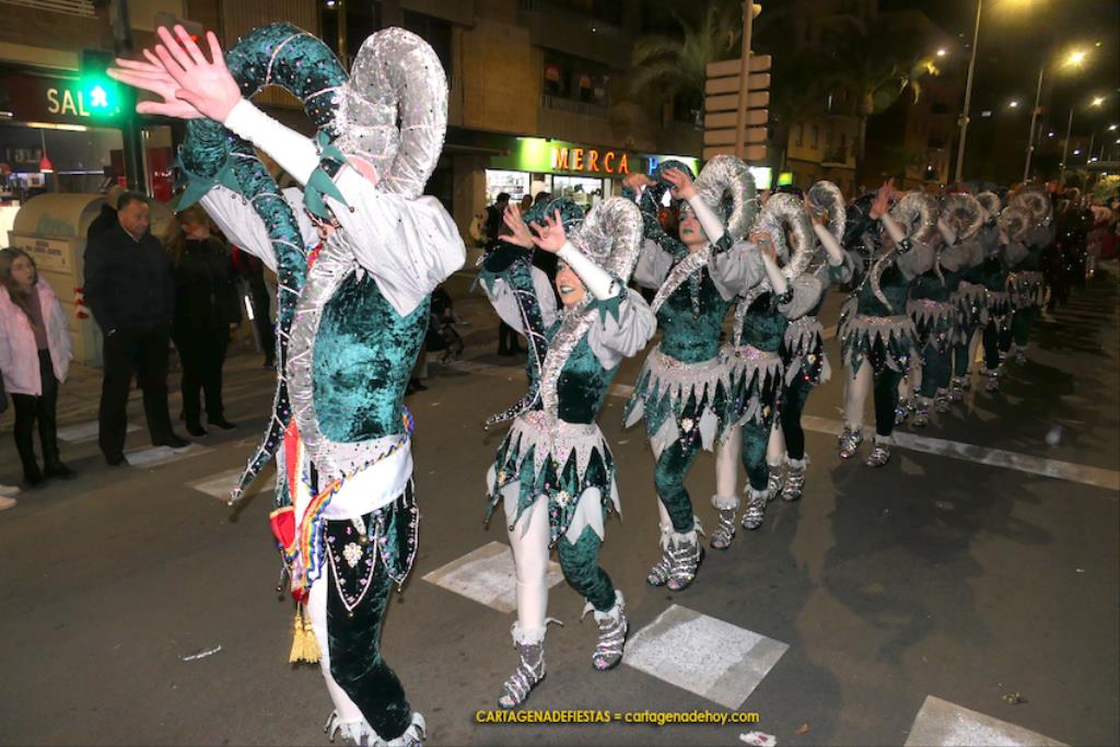 El desfile lo abrían colectivos no carnavaleros, pero habituales al desfile, como Viva Gym y los scout de Inhala Panzy de Canteras, dando paso a la carroza de la doble versión (adulta e infantil) de Don Carnal y Doña Cuaresma. A continuación las entrañables comparsas infantiles, donde muchos integrantes desmuestran ya sus ilusión por esta fiesta. Siguieron los mayores con variados disfraces, desde 'Barbie' hasta los protagonistas de 'Lo que el viento se llevó' (Barriada Virgen de la Caridad), cerrando la carroza con los reyes de este año, surgidos de La Manga.