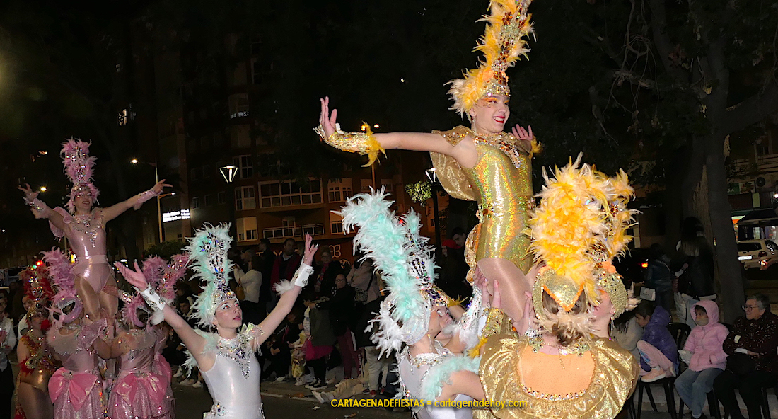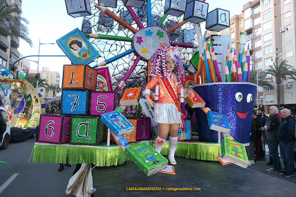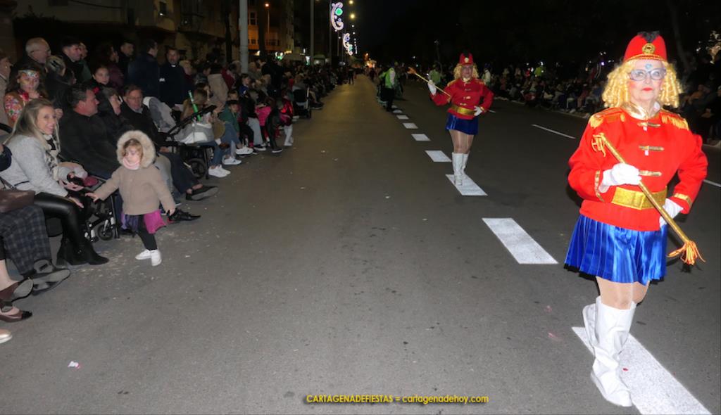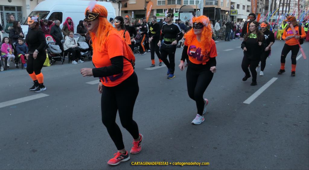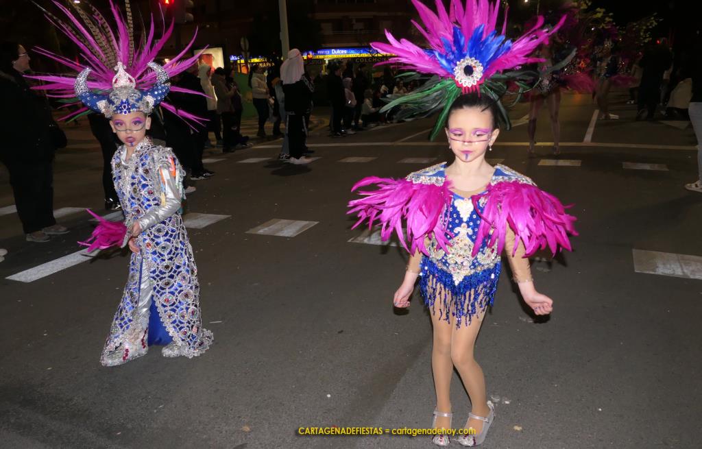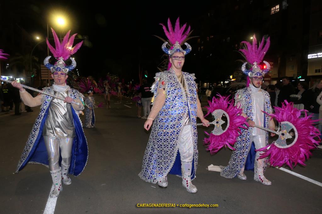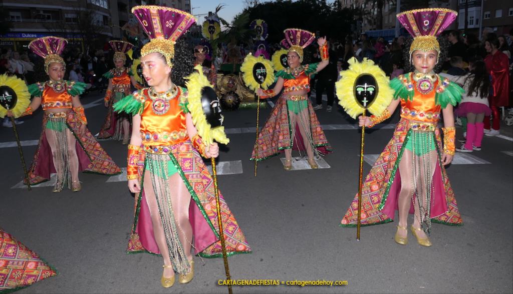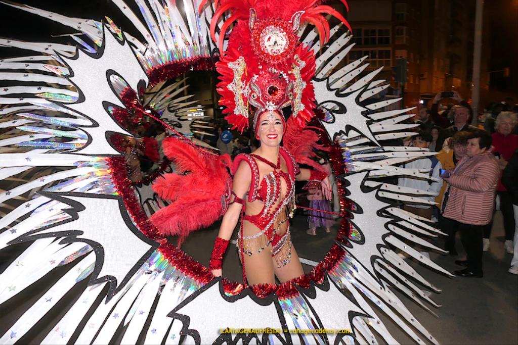 El desfile lo abrían colectivos no carnavaleros, pero habituales al desfile, como Viva Gym y los scout de Inhala Panzy de Canteras, dando paso a la carroza de la doble versión (adulta e infantil) de Don Carnal y Doña Cuaresma. A continuación las entrañables comparsas infantiles, donde muchos integrantes desmuestran ya sus ilusión por esta fiesta. Siguieron los mayores con variados disfraces, desde 'Barbie' hasta los protagonistas de 'Lo que el viento se llevó' (Barriada Virgen de la Caridad), cerrando la carroza con los reyes de este año, surgidos de La Manga.