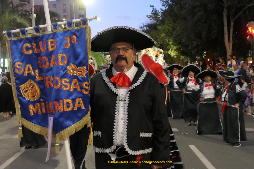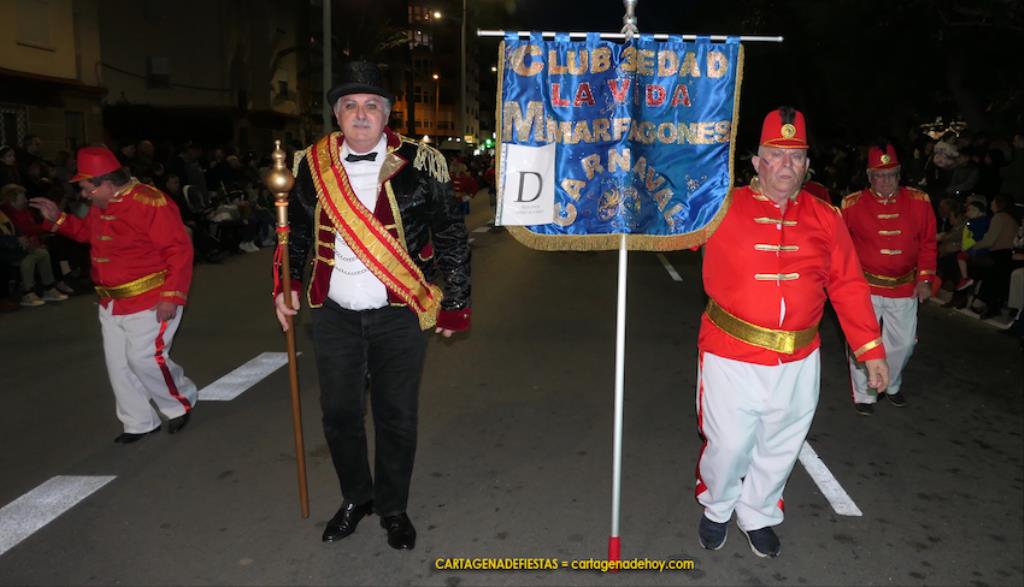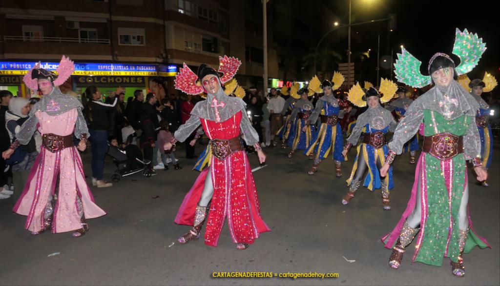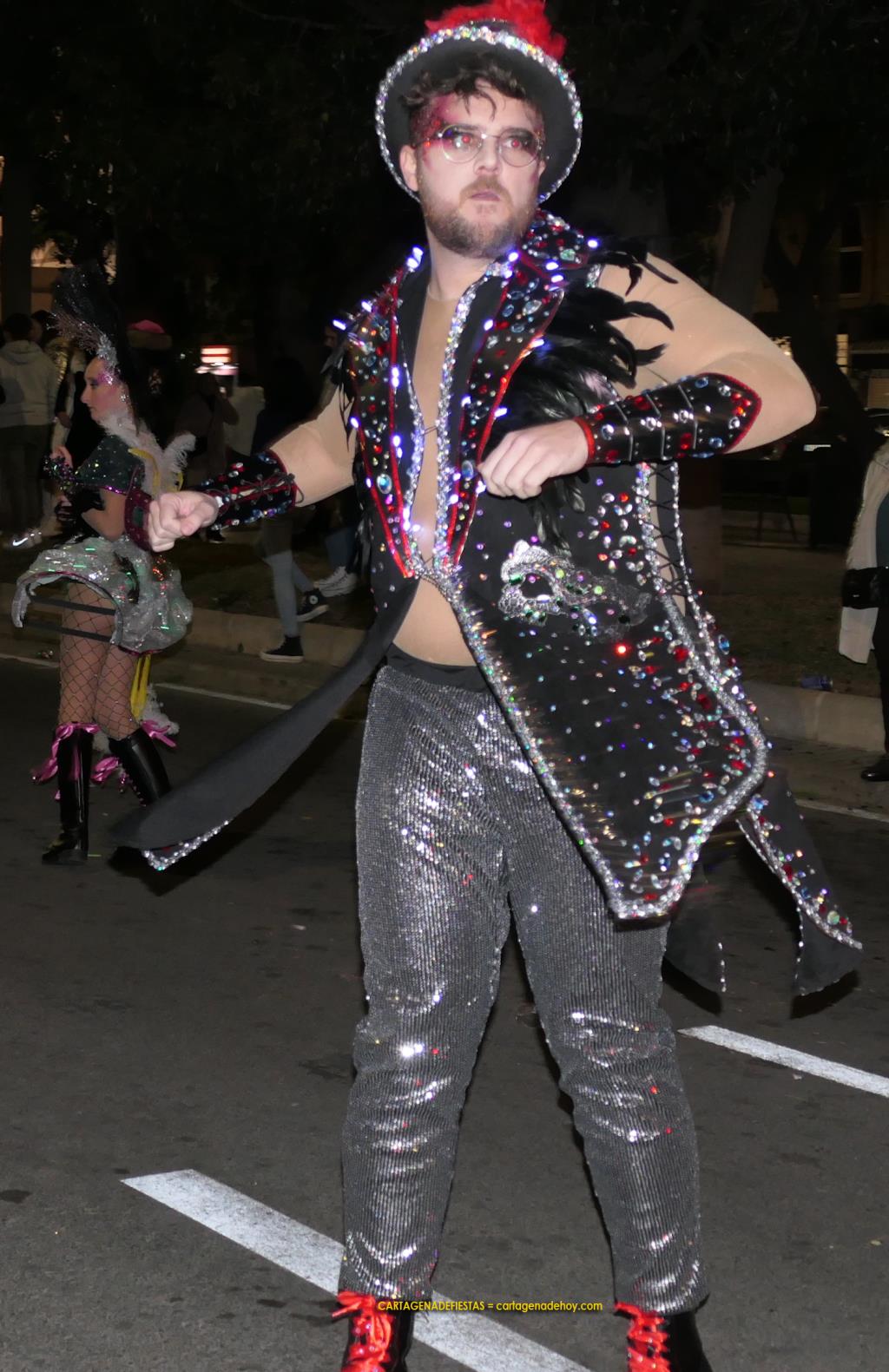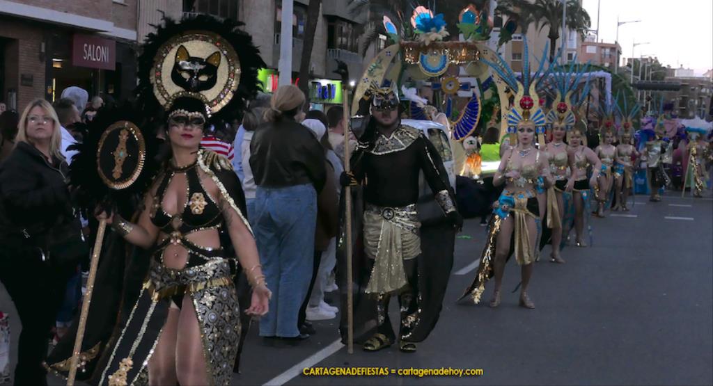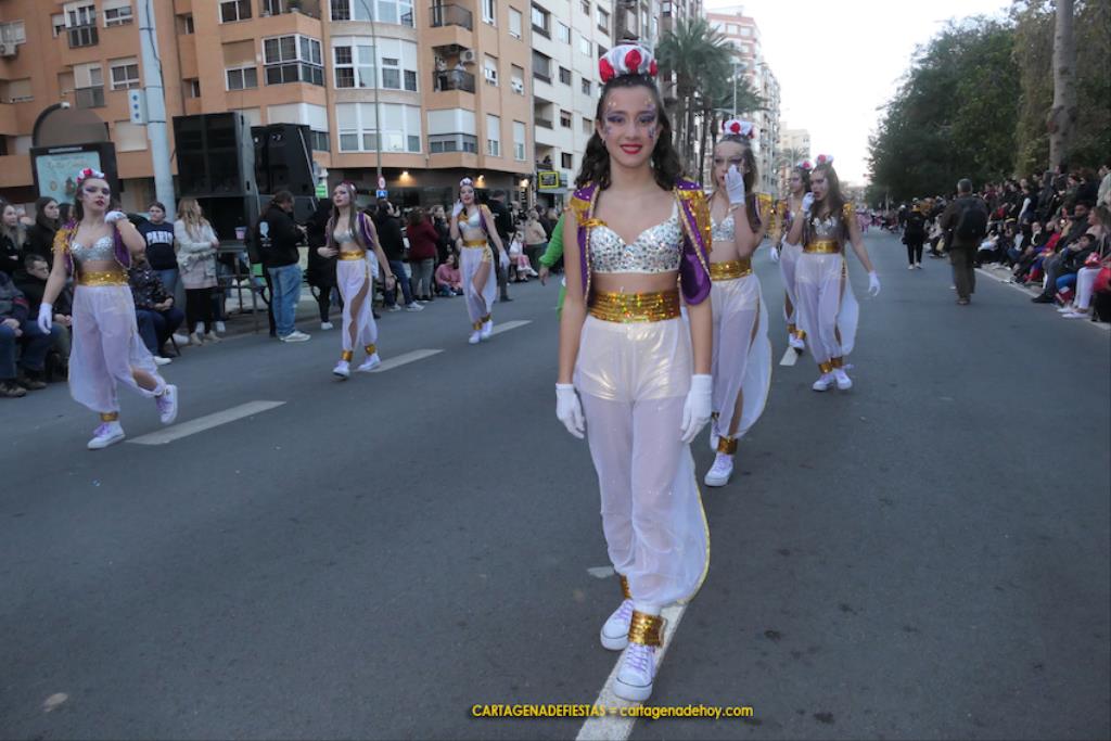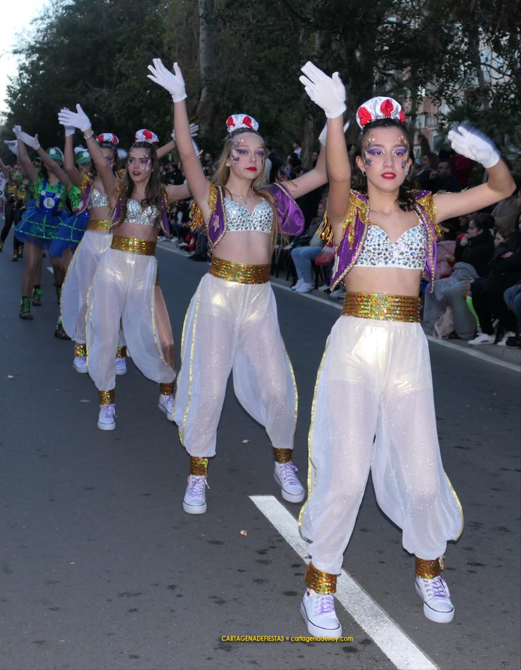 El desfile lo abrían colectivos no carnavaleros, pero habituales al desfile, como Viva Gym y los scout de Inhala Panzy de Canteras, dando paso a la carroza de la doble versión (adulta e infantil) de Don Carnal y Doña Cuaresma. A continuación las entrañables comparsas infantiles, donde muchos integrantes desmuestran ya sus ilusión por esta fiesta. Siguieron los mayores con variados disfraces, desde 'Barbie' hasta los protagonistas de 'Lo que el viento se llevó' (Barriada Virgen de la Caridad), cerrando la carroza con los reyes de este año, surgidos de La Manga.