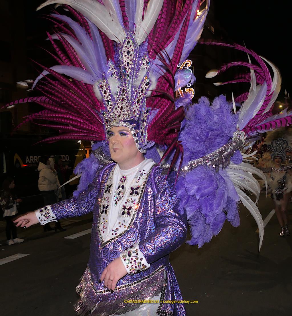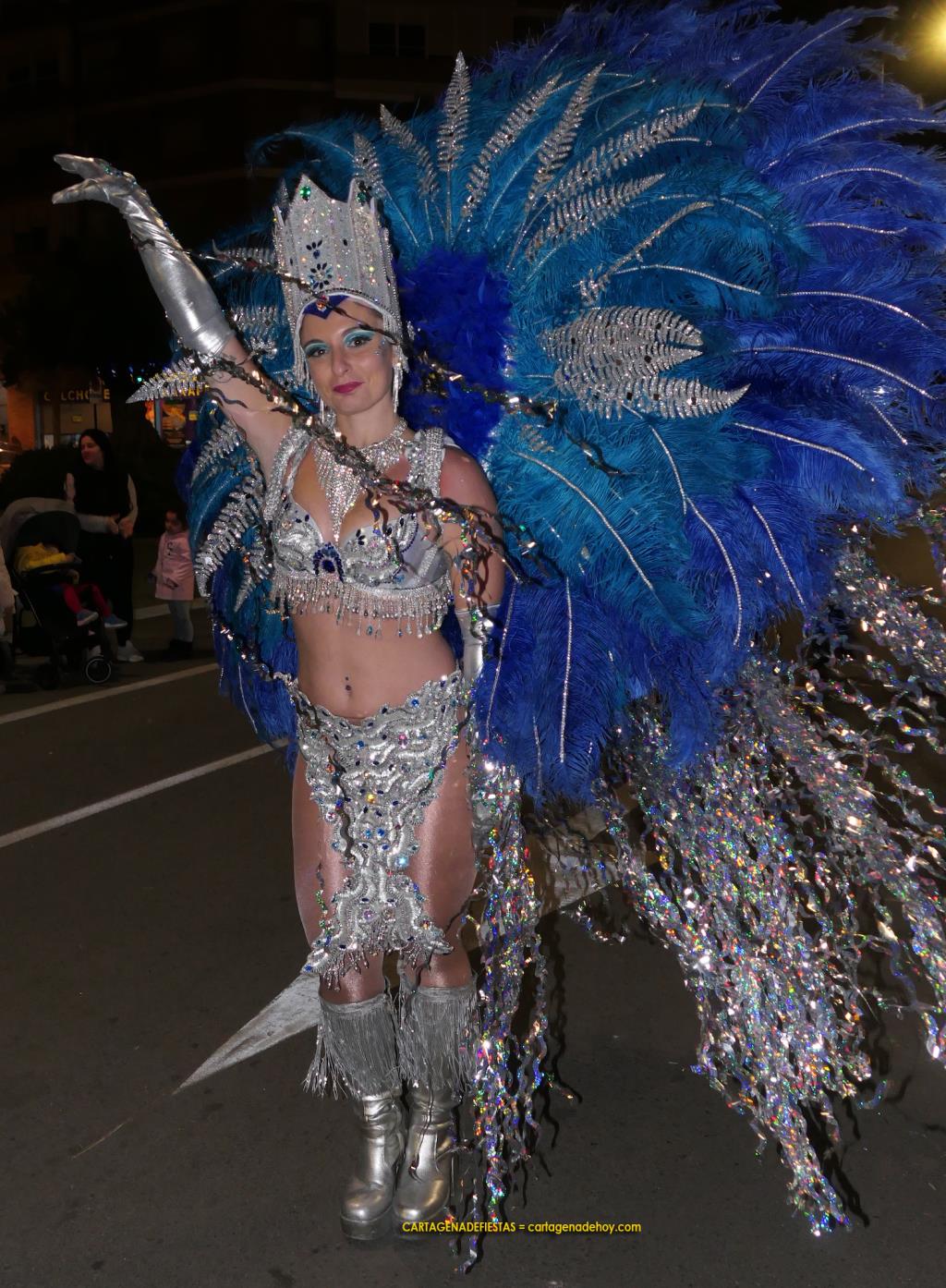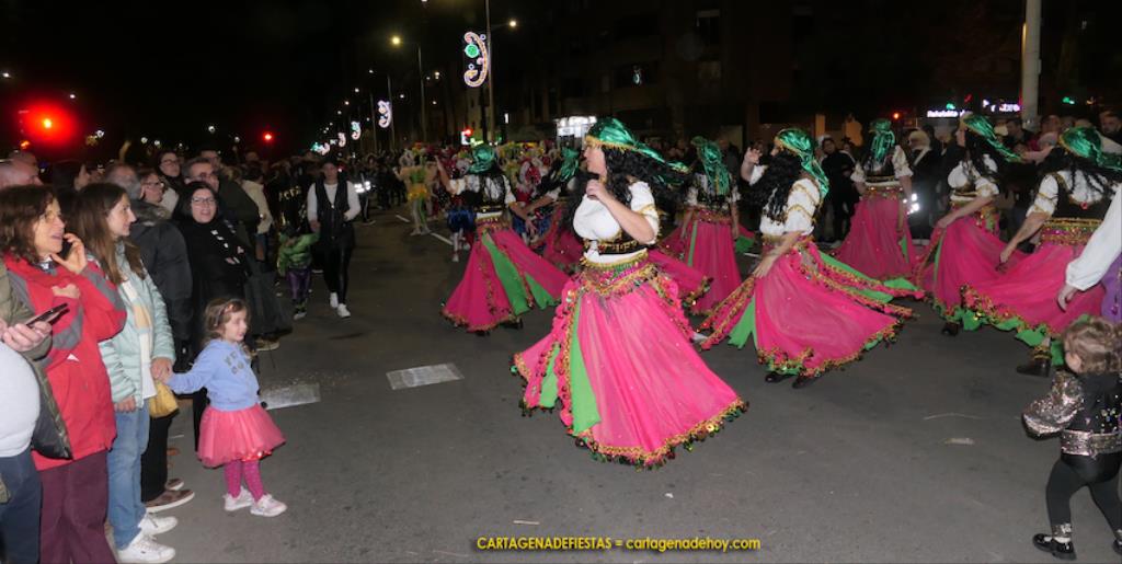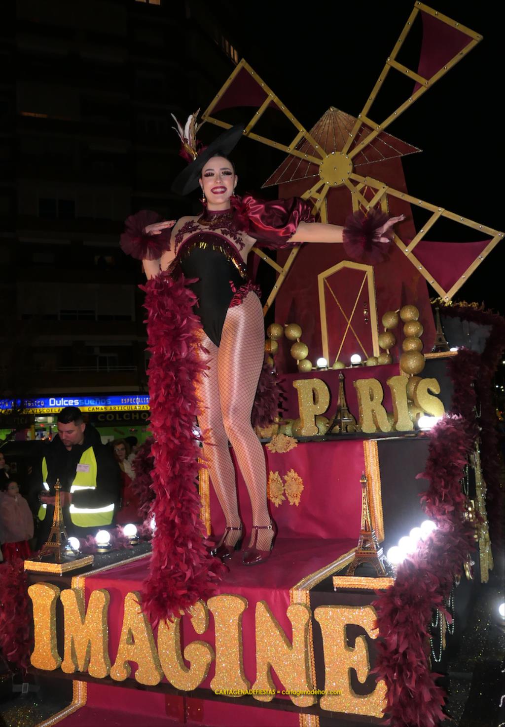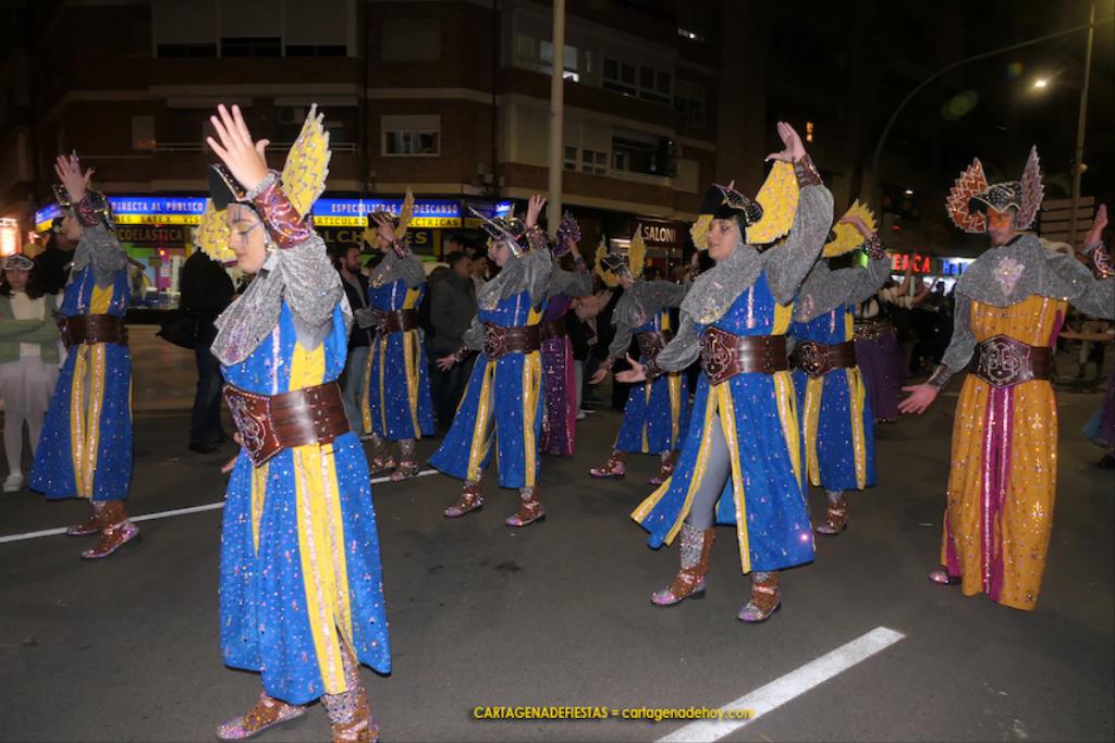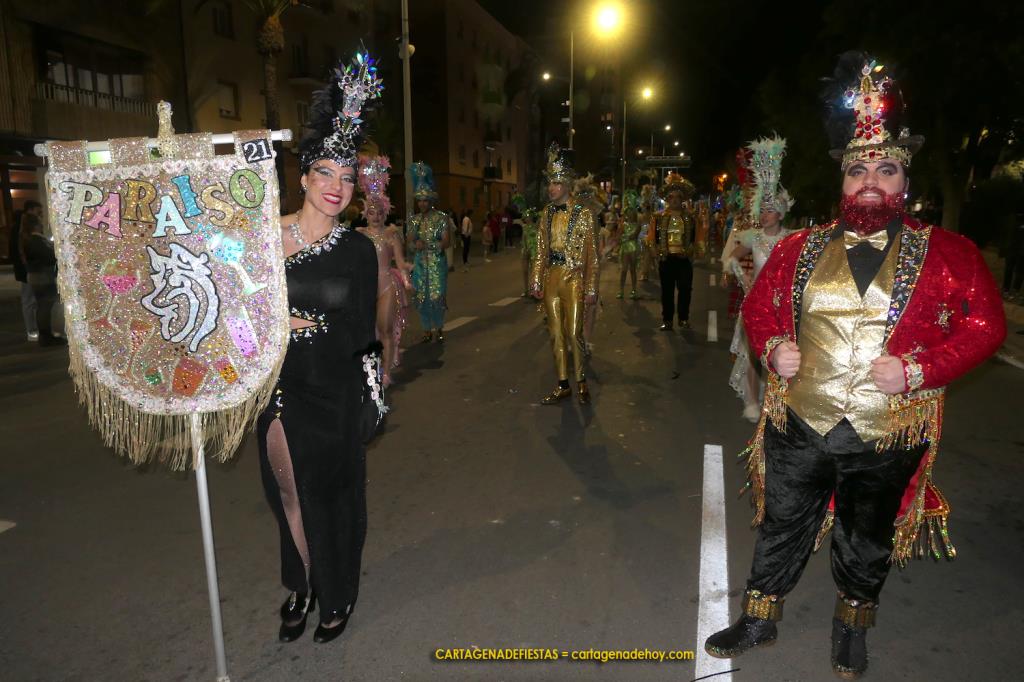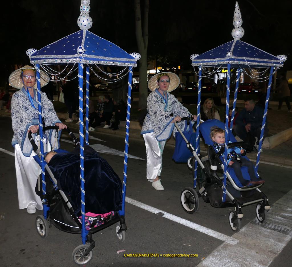 El desfile lo abrían colectivos no carnavaleros, pero habituales al desfile, como Viva Gym y los scout de Inhala Panzy de Canteras, dando paso a la carroza de la doble versión (adulta e infantil) de Don Carnal y Doña Cuaresma. A continuación las entrañables comparsas infantiles, donde muchos integrantes desmuestran ya sus ilusión por esta fiesta. Siguieron los mayores con variados disfraces, desde 'Barbie' hasta los protagonistas de 'Lo que el viento se llevó' (Barriada Virgen de la Caridad), cerrando la carroza con los reyes de este año, surgidos de La Manga.