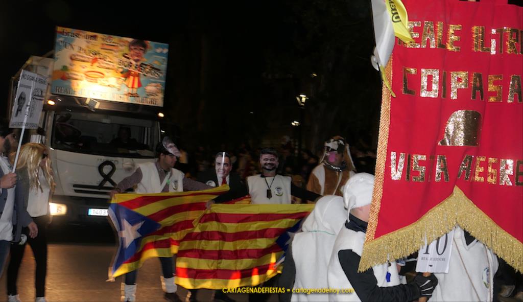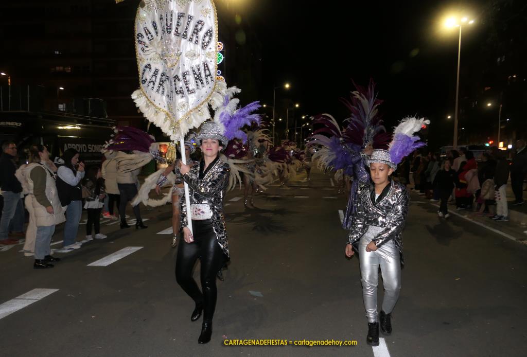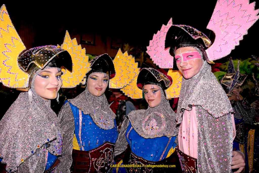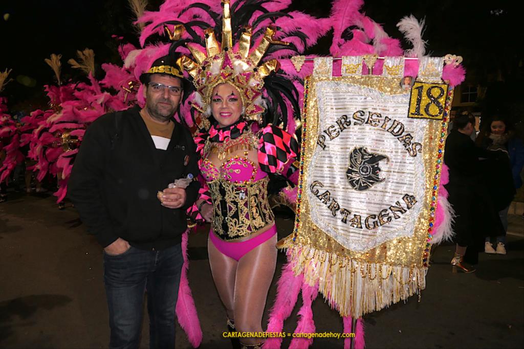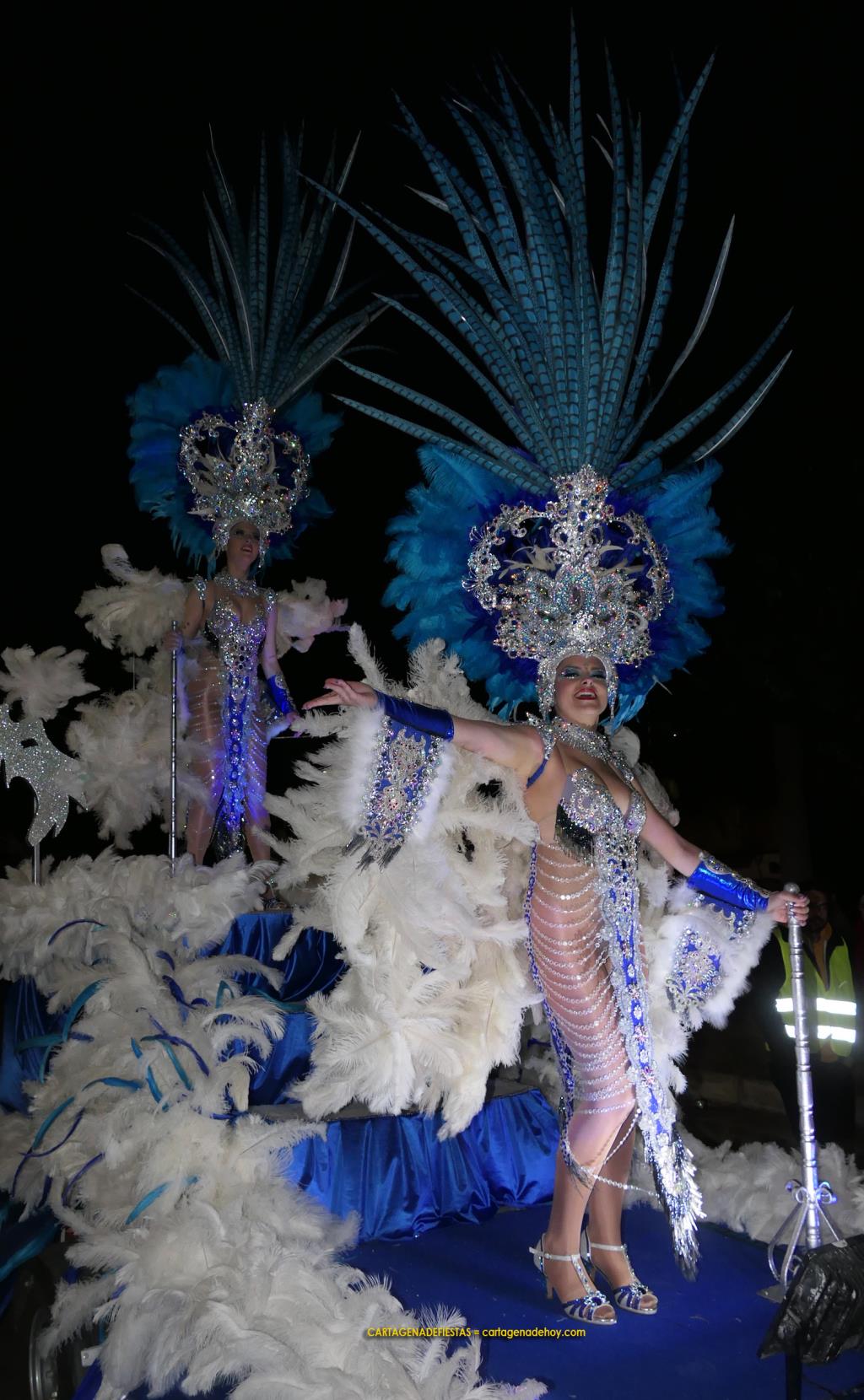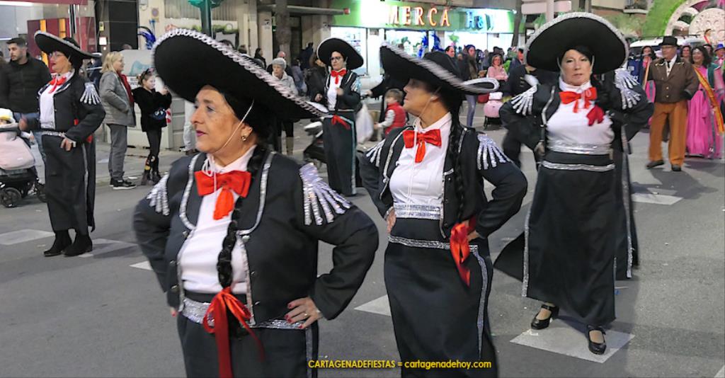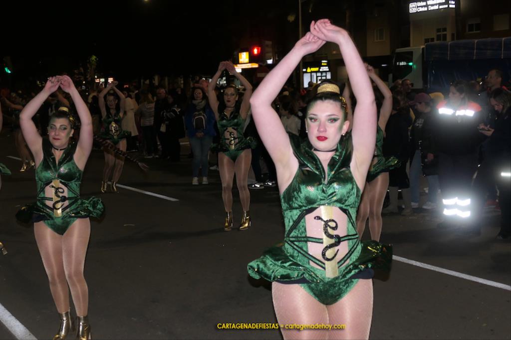 El desfile lo abrían colectivos no carnavaleros, pero habituales al desfile, como Viva Gym y los scout de Inhala Panzy de Canteras, dando paso a la carroza de la doble versión (adulta e infantil) de Don Carnal y Doña Cuaresma. A continuación las entrañables comparsas infantiles, donde muchos integrantes desmuestran ya sus ilusión por esta fiesta. Siguieron los mayores con variados disfraces, desde 'Barbie' hasta los protagonistas de 'Lo que el viento se llevó' (Barriada Virgen de la Caridad), cerrando la carroza con los reyes de este año, surgidos de La Manga.
