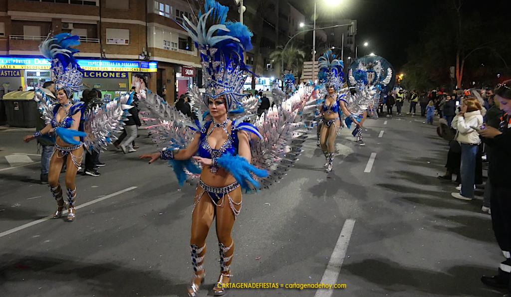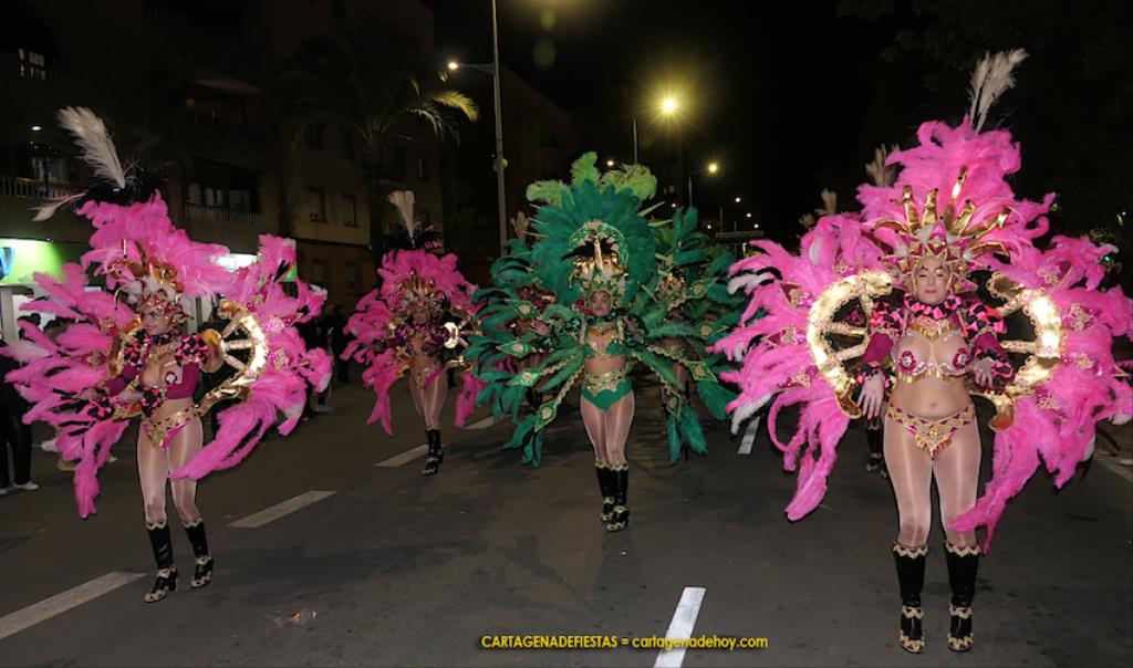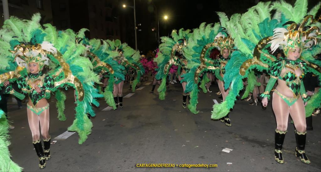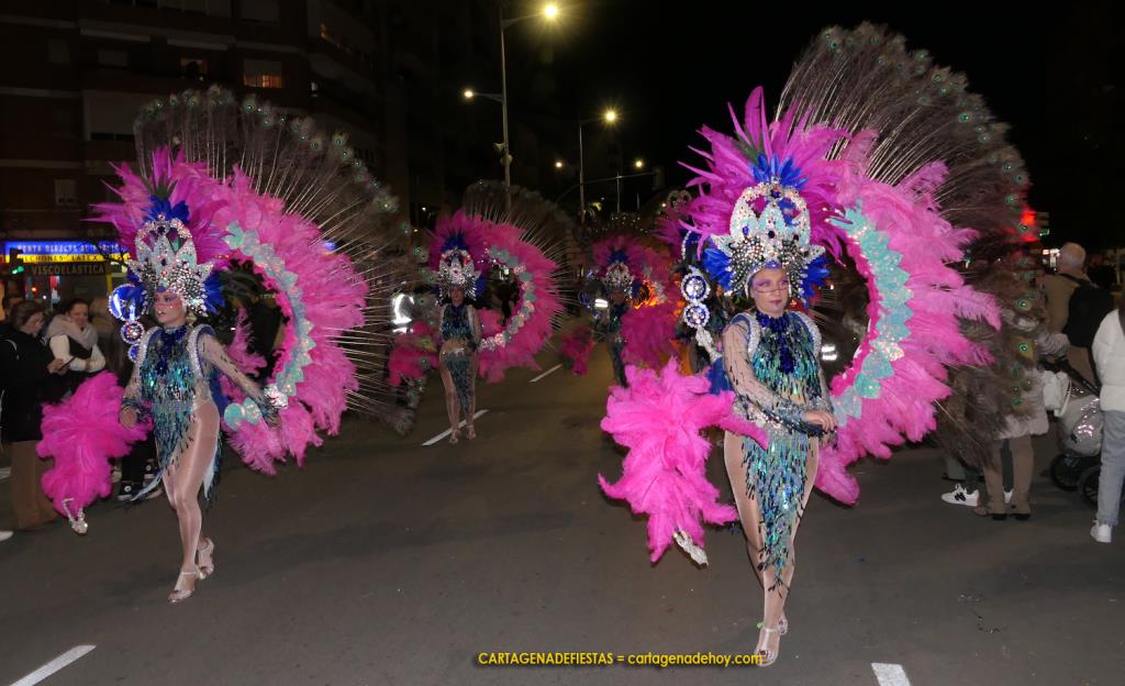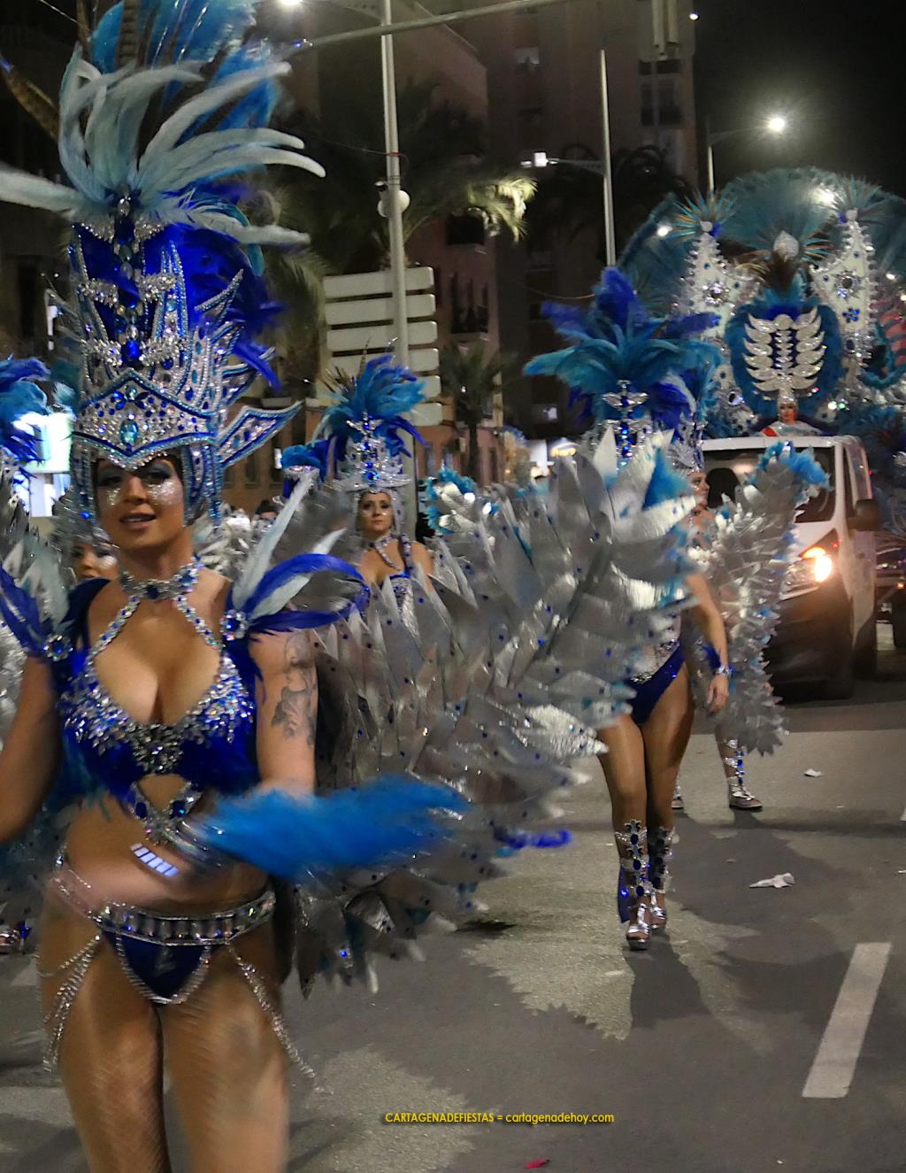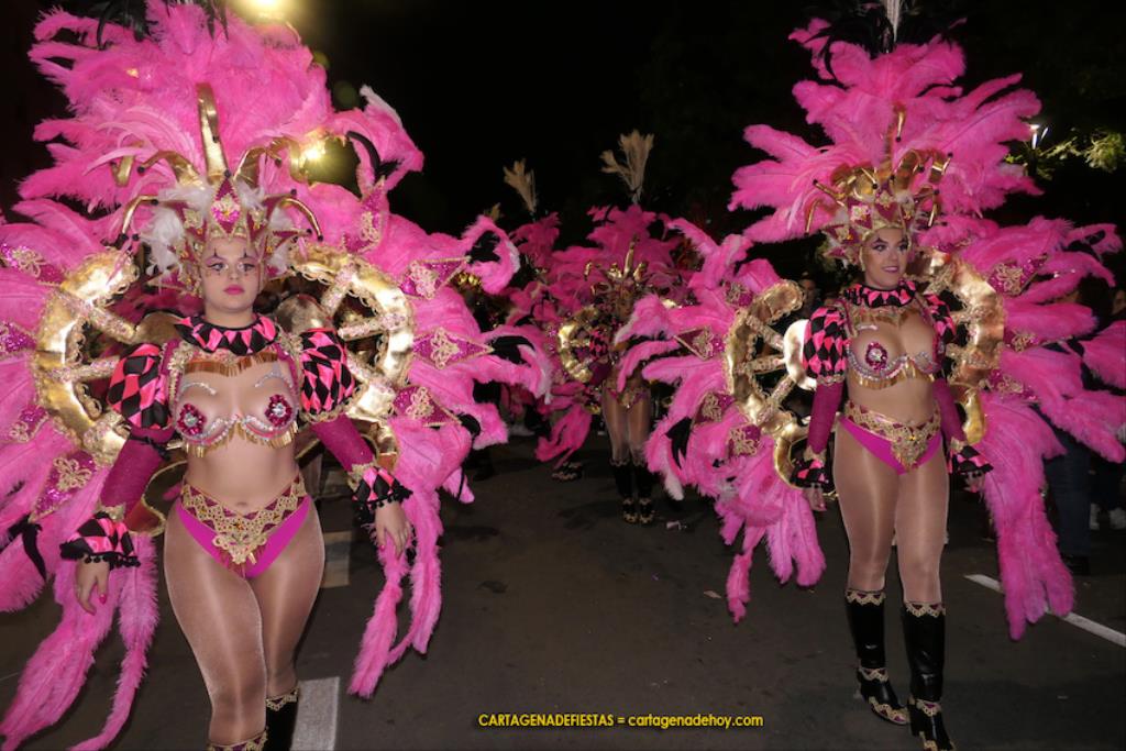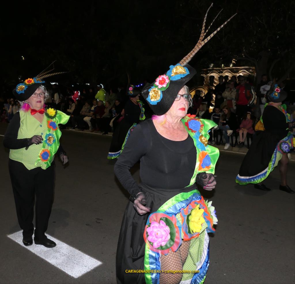 La Real e Ilustre de Vista Alegre puso la 'aborregada' crítica de este año, lo que tiene artículo propio en este periódico de Cartagena y su gente, al igual que el novedoso e inclusivo grupo de la ONCE. Nos queda referirnos a las comparsas adultas. Mucha pluma, ritmo coordinado e imaginación. Fueron, demás de las mentadas arriba: Sambao, Aporué, Atalaya, Ipanema, Divertilandia, Imagine, Renacer, Perseídas (las más 'carnales'), Deja Vu, Nova Carthago Paraíso, Antares, Ilusión de Galifa (con 3 plataformas), Las Villas de San Antón y las dolorenses de Limón y Sal.