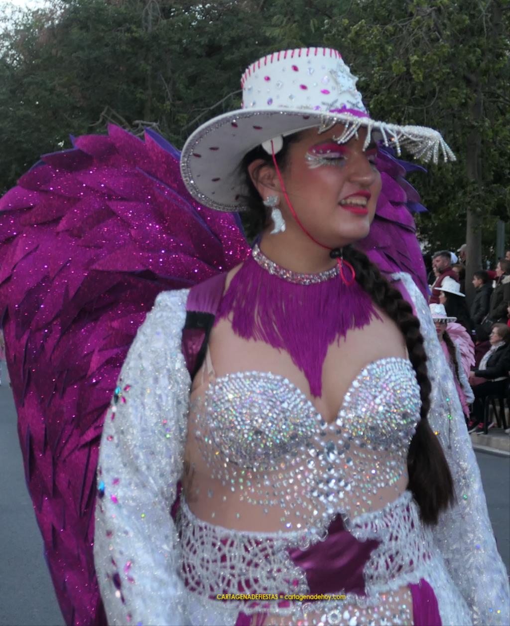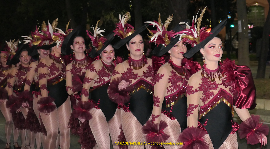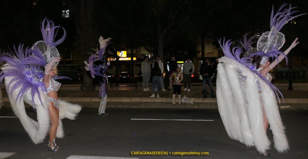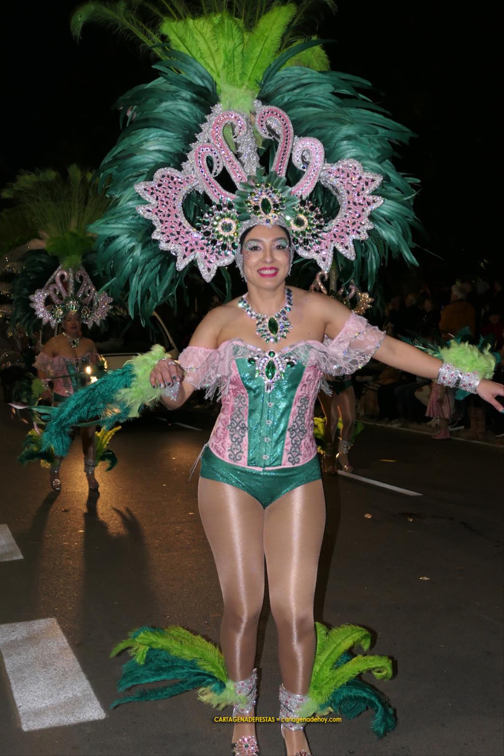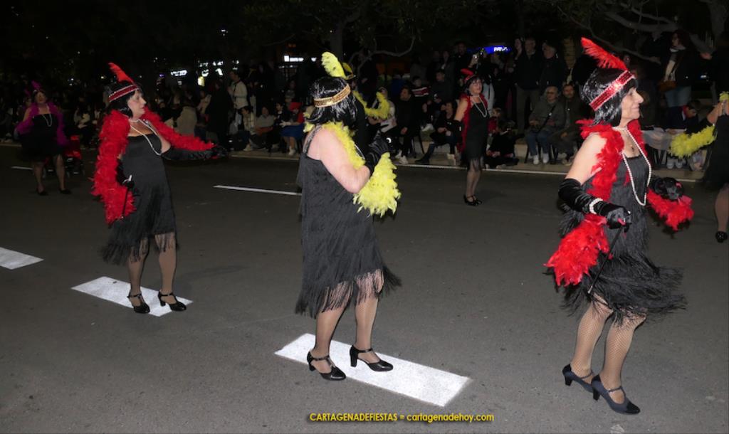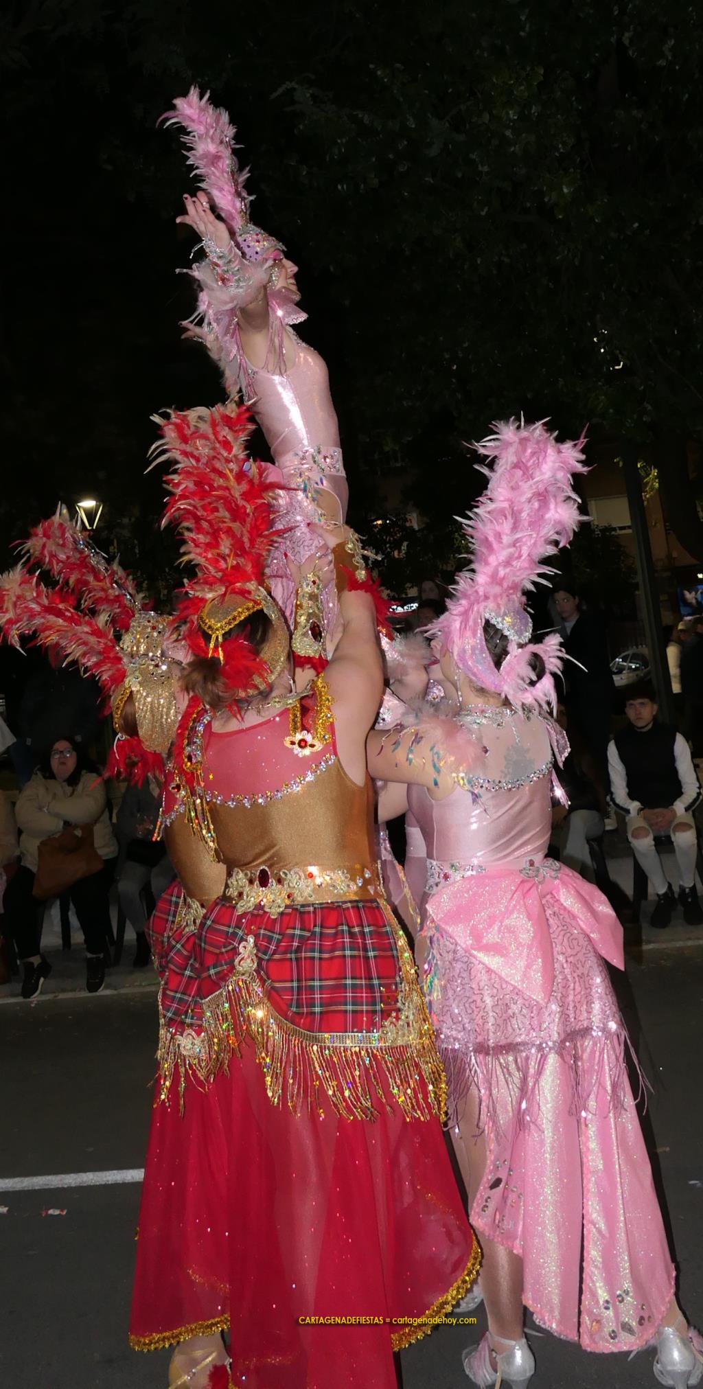 La Real e Ilustre de Vista Alegre puso la 'aborregada' crítica de este año, lo que tiene artículo propio en este periódico de Cartagena y su gente, al igual que el novedoso e inclusivo grupo de la ONCE. Nos queda referirnos a las comparsas adultas. Mucha pluma, ritmo coordinado e imaginación. Fueron, demás de las mentadas arriba: Sambao, Aporué, Atalaya, Ipanema, Divertilandia, Imagine, Renacer, Perseídas (las más 'carnales'), Deja Vu, Nova Carthago Paraíso, Antares, Ilusión de Galifa (con 3 plataformas), Las Villas de San Antón y las dolorenses de Limón y Sal.