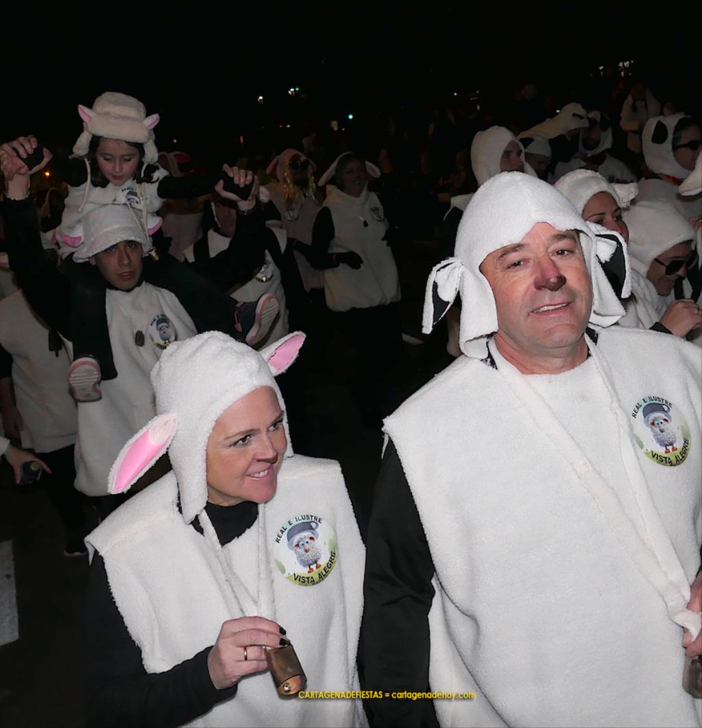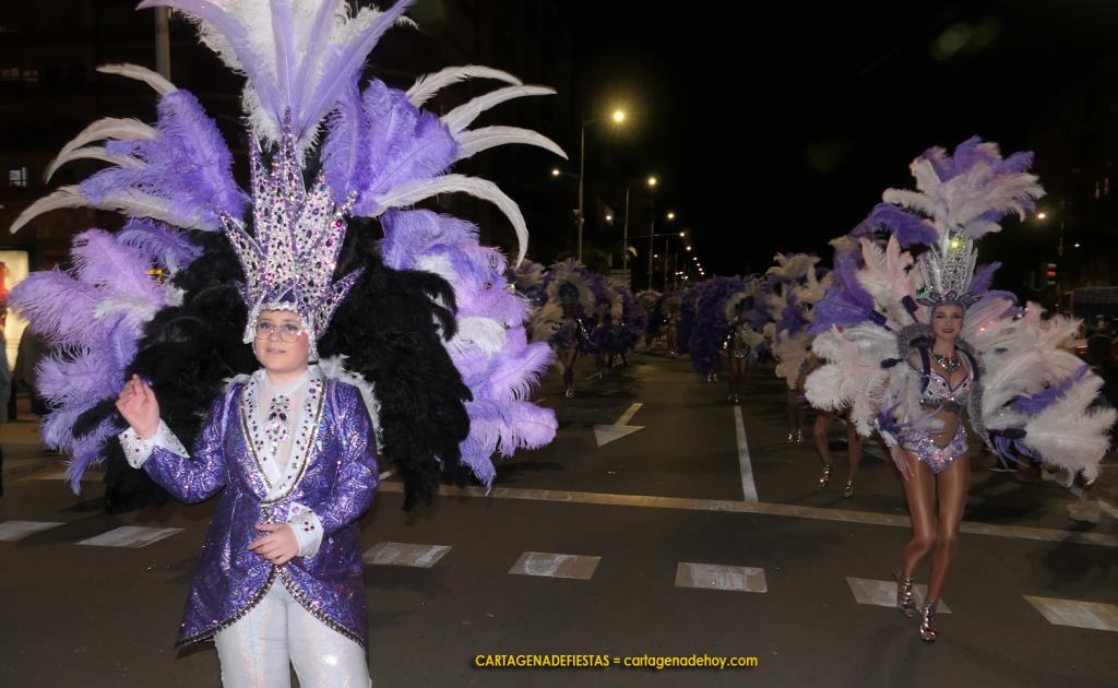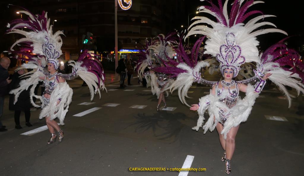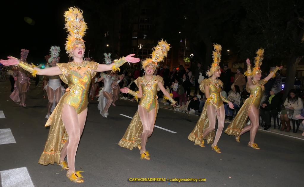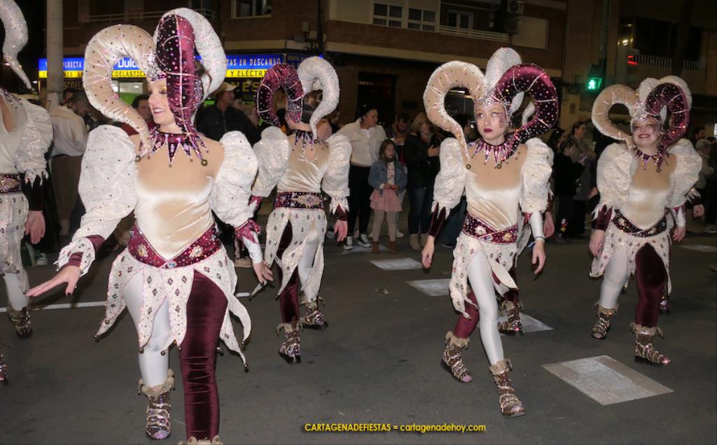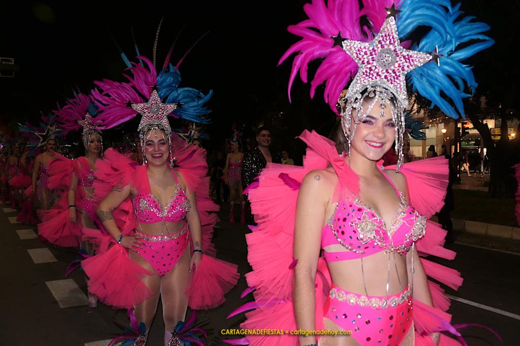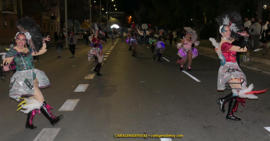 La Real e Ilustre de Vista Alegre puso la 'aborregada' crítica de este año, lo que tiene artículo propio en este periódico de Cartagena y su gente, al igual que el novedoso e inclusivo grupo de la ONCE. Nos queda referirnos a las comparsas adultas. Mucha pluma, ritmo coordinado e imaginación. Fueron, demás de las mentadas arriba: Sambao, Aporué, Atalaya, Ipanema, Divertilandia, Imagine, Renacer, Perseídas (las más 'carnales'), Deja Vu, Nova Carthago Paraíso, Antares, Ilusión de Galifa (con 3 plataformas), Las Villas de San Antón y las dolorenses de Limón y Sal.
