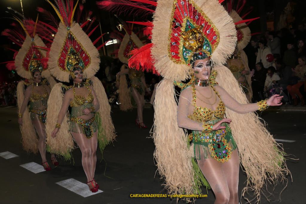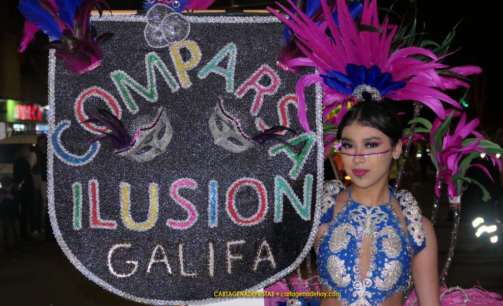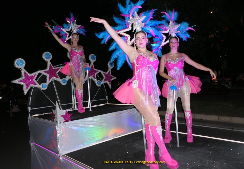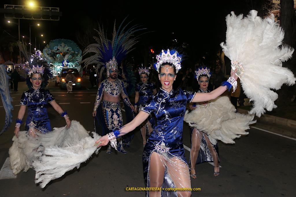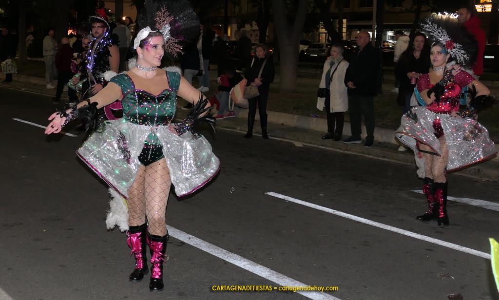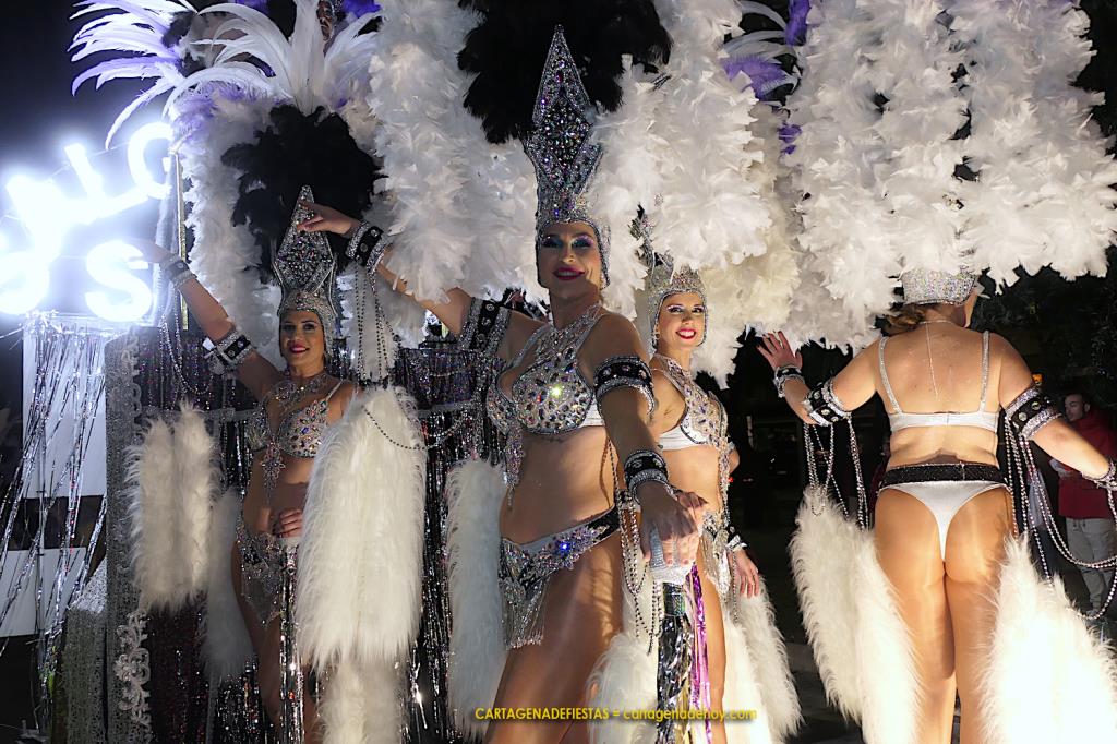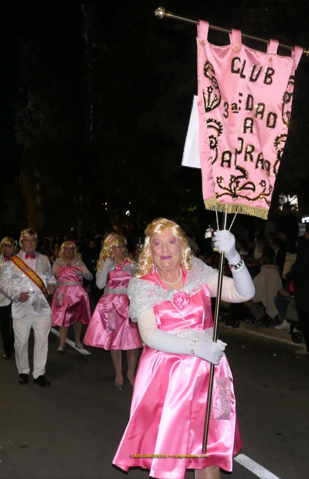 La Real e Ilustre de Vista Alegre puso la 'aborregada' crítica de este año, lo que tiene artículo propio en este periódico de Cartagena y su gente, al igual que el novedoso e inclusivo grupo de la ONCE. Nos queda referirnos a las comparsas adultas. Mucha pluma, ritmo coordinado e imaginación. Fueron, demás de las mentadas arriba: Sambao, Aporué, Atalaya, Ipanema, Divertilandia, Imagine, Renacer, Perseídas (las más 'carnales'), Deja Vu, Nova Carthago Paraíso, Antares, Ilusión de Galifa (con 3 plataformas), Las Villas de San Antón y las dolorenses de Limón y Sal.