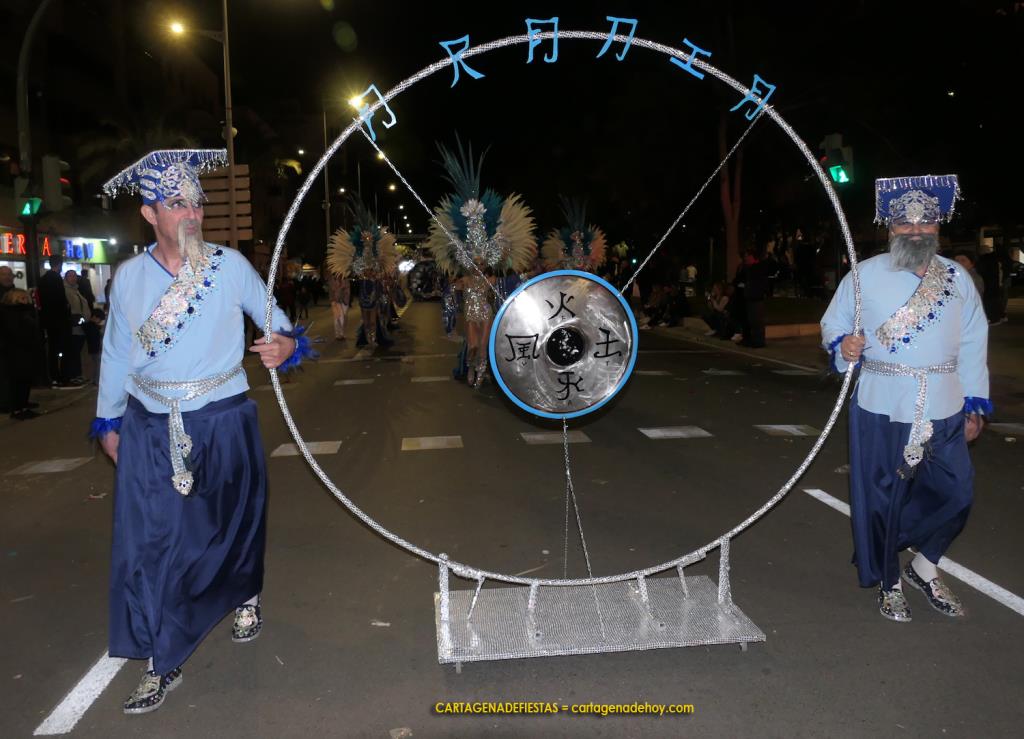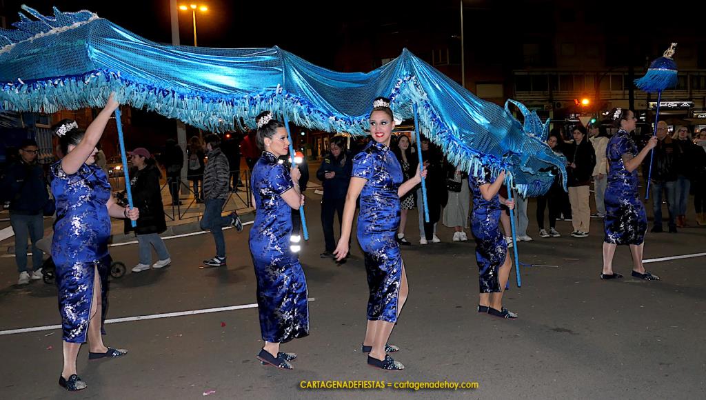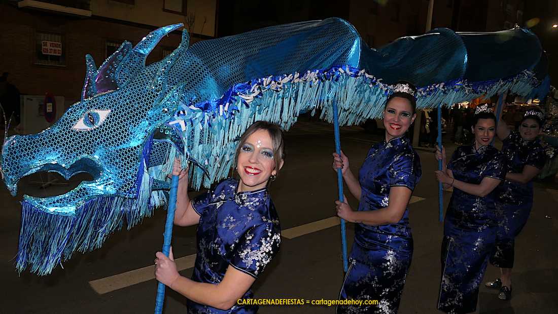 El ritmo, la alegría y el colorido del gran desfile del carnaval aladroque (apelativo de los cartageneros) fue puesto en la calle, durante tres horas, por unas dos mil personas repartidas en treinta y seis grupos (sólo uno foráneo) que hicieron frente a una tarde-noche de frío y viento. En las fotos, el dragón chino de Aradia y, abajo, una 'plumífera flor' de Ipanema / El artículo ofrece MACROGALERÍA DE FOTOS.