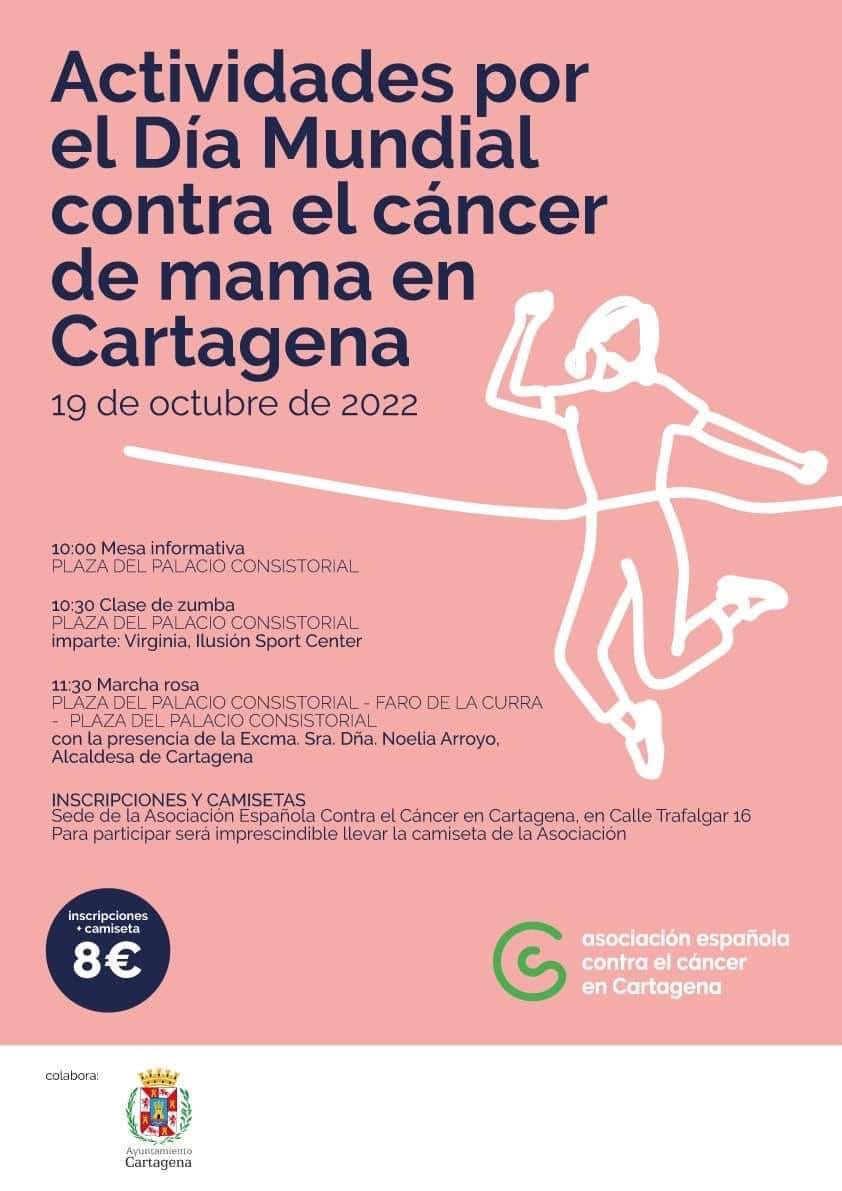 La caminata entre la plaza del Ayuntamiento y el faro de La Curra será el acto central del ‘Día mundial contra el cáncer de mama’ en Cartagena, que también incluye la instalación de una mesa informativa y una clase de zumba. Las inscripciones con camiseta para la ‘marcha rosa’, en la que anuncia su participación la alcaldesa, cuestan 8 euros y se pueden obtener en la sede de la AECC de la calle Trafalgar, número 16, de Cartagena. Para participar es imprescindible llevar la camiseta de la asociación, indican los organizadores.