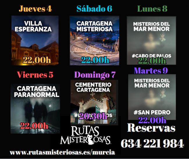 La empresa ‘Rutas misteriosas’ ya ha llevado a cabo esta semana escalas en Cabo de Palos, San Pedro del Pinatar y Puerto de Mazarrón, dejando la costa a partir de hoy con las propuestas de Villa Esperanza, ‘Cartagena paranormal’, ‘Cartagena misteriosa’ y una ronda nocturna por el cementerio de Nuestra Señora de los Remedios.