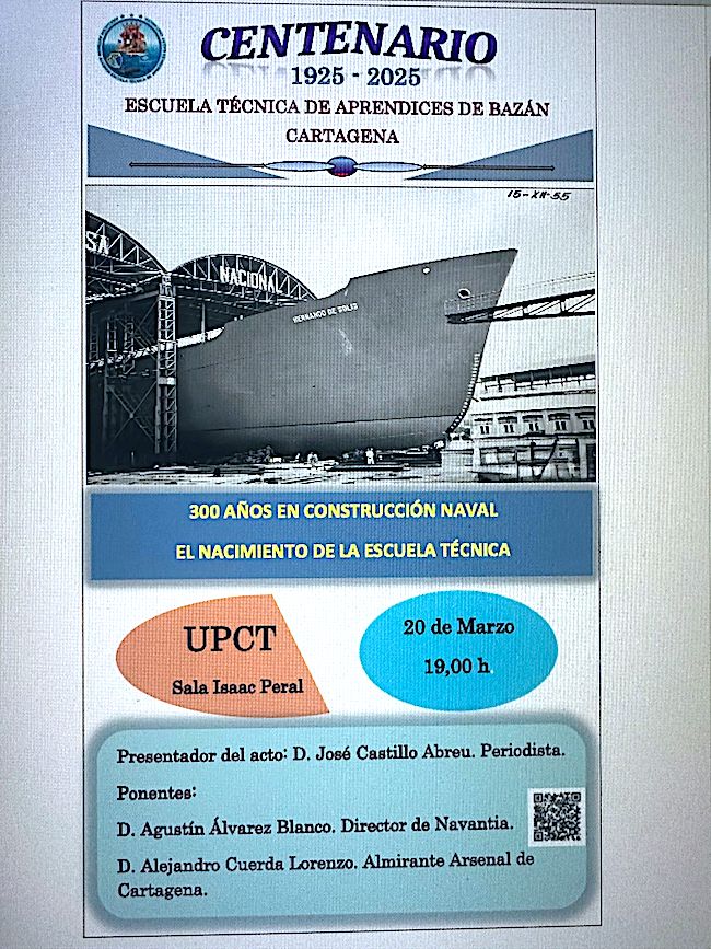Dentro de los actos del centenario (1925-2025) de la 'Escuela técnica de aprendices de Bazán', esta tarde-noche tiene lugar la ponencia '300 años en construcción naval - El nacimiento de la escuela técnica', a cago de Agustín Álvarez y del almirante Alejandro Cuerda.