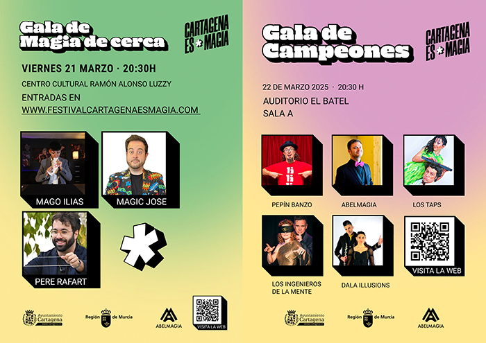 Cartagena se convierte este fin de semana en la capital del ilusionismo con el tercer festival internacional Cartagena es Magia, que reunirá del 21 al 23 de marzo a los ilusionistas más reconocidos de dentro y fuera de nuestro país. El certamen, impulsado por el Ayuntamiento de Cartagena, ha programado espectáculos gratuitos en diferentes puntos del centro de la ciudad, como el parque de Los Juncos o la plaza del Icue; así como dos grandes citas, la gala de Magia de Cerca en el Centro Cultural Ramón Alonso Luzzy y la Gala de Campeones en el auditorio El Batel. Toda la programación, adjunta a esta noticia, y las entradas están disponibles en la web www.festivalcartagenaesmagia.com