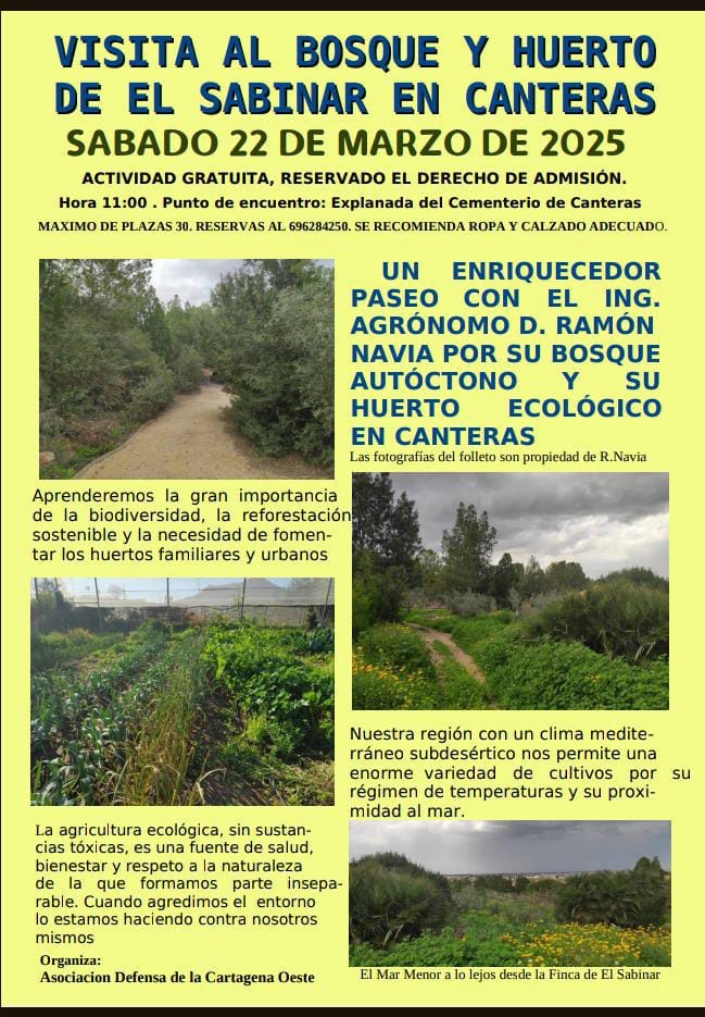 La 'Asociación de defensa de la Cartagena Oeste' organiza para este sábado por la mañana una actividad gratuita con visita al bosque y huerto de El Sabinar. Reservas previas para participar.