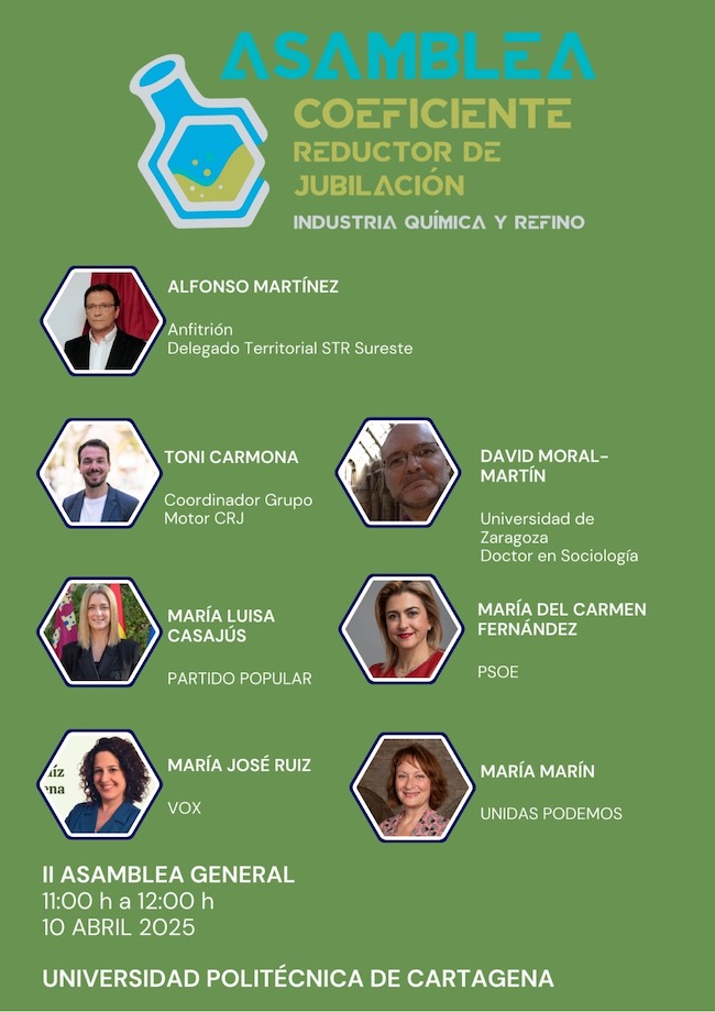 El Grupo Motor por el Coeficiente Reductor del Jubilación (CRJ) para los trabajadores de la industria química y el refino va a celebrar en Cartagena su II Asamblea Nacional. Un encuentro en que se darán cita 150 personas y que se celebrará el mañana jueves 10 de abril en el salón de actos de la Escuela Técnica Superior de Ingeniería Agronómica de la UPCT, sito en el paseo Alfonso XIII.