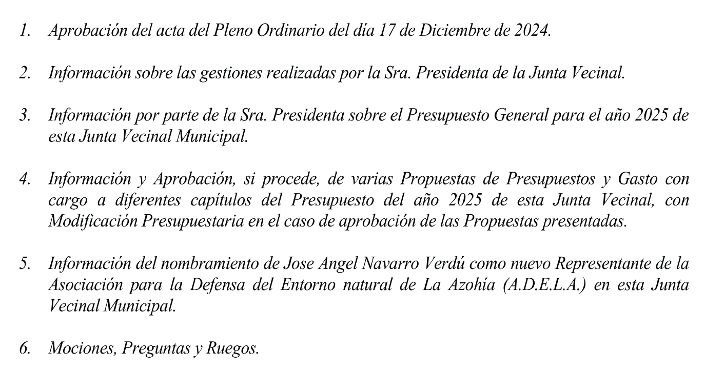 El pleno ordinario comenzará a las 20.30 horas en el local social de Isla Plana con este orden del día: